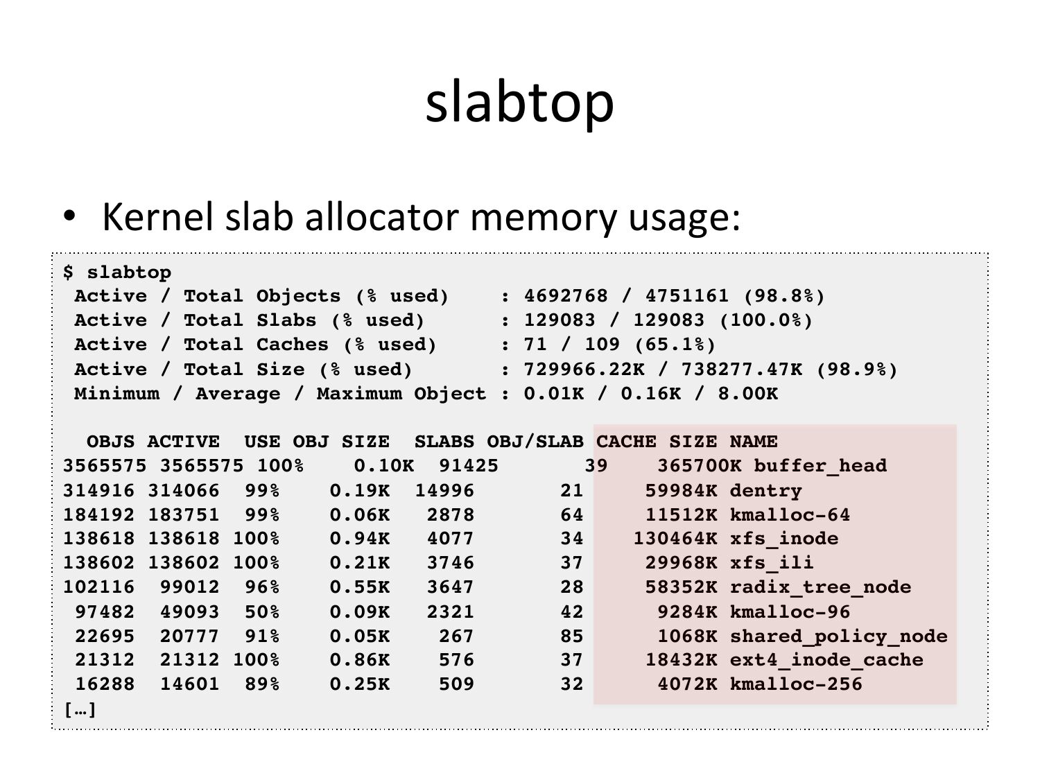 slabtop • Kernel slab allocator memory usage: $ slabtop! Active / Total Objects (% used) : 4692768 / 4751161 (98.8%)! Active / Total Slabs (% used) : 129083 / 129083 (100.0%)! Active / Total Caches (% used) : 71 / 109 (65.1%)! Active / Total Size (% used) : 729966.22K / 738277.47K (98.9%)! Minimum / Average / Maximum Object : 0.01K / 0.16K / 8.00K! OBJS ACTIVE USE OBJ SIZE SLABS OBJ/SLAB CACHE SIZE NAME 3565575 3565575 100% 0.10K 91425 365700K buffer_head! 314916 314066 99% 0.19K 14996 59984K dentry! 184192 183751 99% 0.06K 11512K kmalloc-64! 138618 138618 100% 0.94K 130464K xfs_inode! 138602 138602 100% 0.21K 29968K xfs_ili! 102116 99012 96% 0.55K 58352K radix_tree_node! 97482 49093 50% 0.09K 9284K kmalloc-96! 22695 20777 91% 0.05K 1068K shared_policy_node! 21312 21312 100% 0.86K 18432K ext4_inode_cache! 16288 14601 89% 0.25K 4072K kmalloc-256! […]!slide 43: