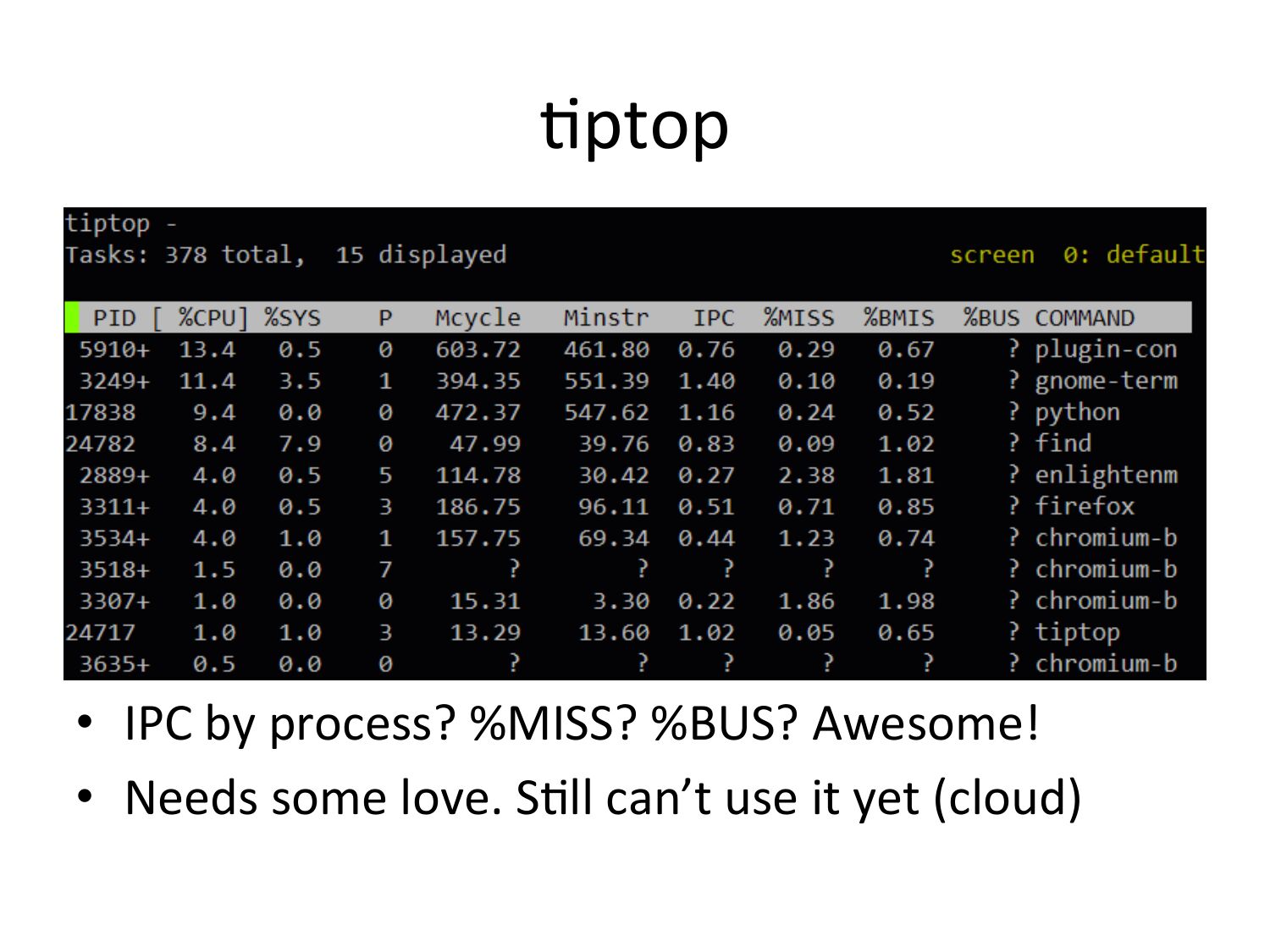 Vptop • IPC by process? %MISS? %BUS? Awesome! • Needs some love. SVll can’t use it yet (cloud)slide 45: