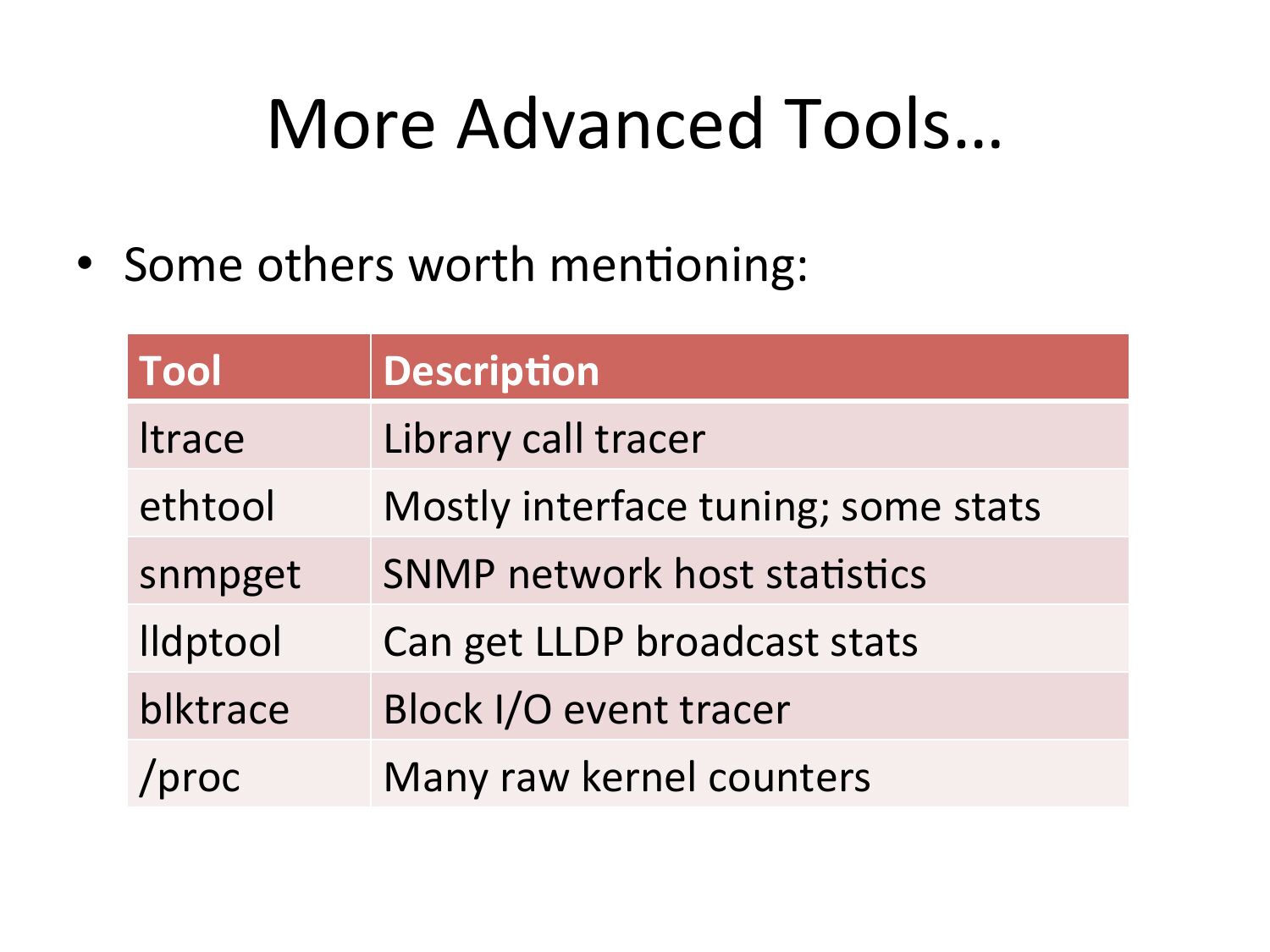 More Advanced Tools… • Some others worth menVoning: Tool ltrace ethtool snmpget lldptool blktrace /proc Descrip.on Library call tracer Mostly interface tuning; some stats SNMP network host staVsVcs Can get LLDP broadcast stats Block I/O event tracer Many raw kernel countersslide 46: