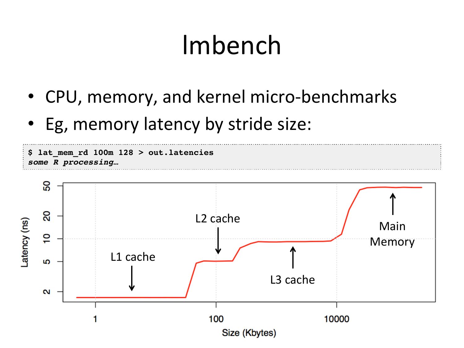 lmbench • CPU, memory, and kernel micro-‐benchmarks • Eg, memory latency by stride size: $ lat_mem_rd 100m 128 >gt; out.latencies! some R processing…! L2 cache Main Memory L1 cache L3 cacheslide 53: