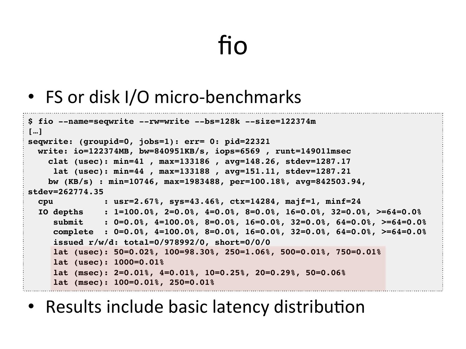 fio • FS or disk I/O micro-‐benchmarks $ fio --name=seqwrite --rw=write --bs=128k --size=122374m! […]! seqwrite: (groupid=0, jobs=1): err= 0: pid=22321! write: io=122374MB, bw=840951KB/s, iops=6569 , runt=149011msec! clat (usec): min=41 , max=133186 , avg=148.26, stdev=1287.17! lat (usec): min=44 , max=133188 , avg=151.11, stdev=1287.21! bw (KB/s) : min=10746, max=1983488, per=100.18%, avg=842503.94, stdev=262774.35! cpu : usr=2.67%, sys=43.46%, ctx=14284, majf=1, minf=24! IO depths : 1=100.0%, 2=0.0%, 4=0.0%, 8=0.0%, 16=0.0%, 32=0.0%, >gt;=64=0.0%! submit : 0=0.0%, 4=100.0%, 8=0.0%, 16=0.0%, 32=0.0%, 64=0.0%, >gt;=64=0.0%! complete : 0=0.0%, 4=100.0%, 8=0.0%, 16=0.0%, 32=0.0%, 64=0.0%, >gt;=64=0.0%! issued r/w/d: total=0/978992/0, short=0/0/0! lat (usec): 50=0.02%, 100=98.30%, 250=1.06%, 500=0.01%, 750=0.01%! lat (usec): 1000=0.01%! lat (msec): 2=0.01%, 4=0.01%, 10=0.25%, 20=0.29%, 50=0.06%! lat (msec): 100=0.01%, 250=0.01%! • Results include basic latency distribuVonslide 54: