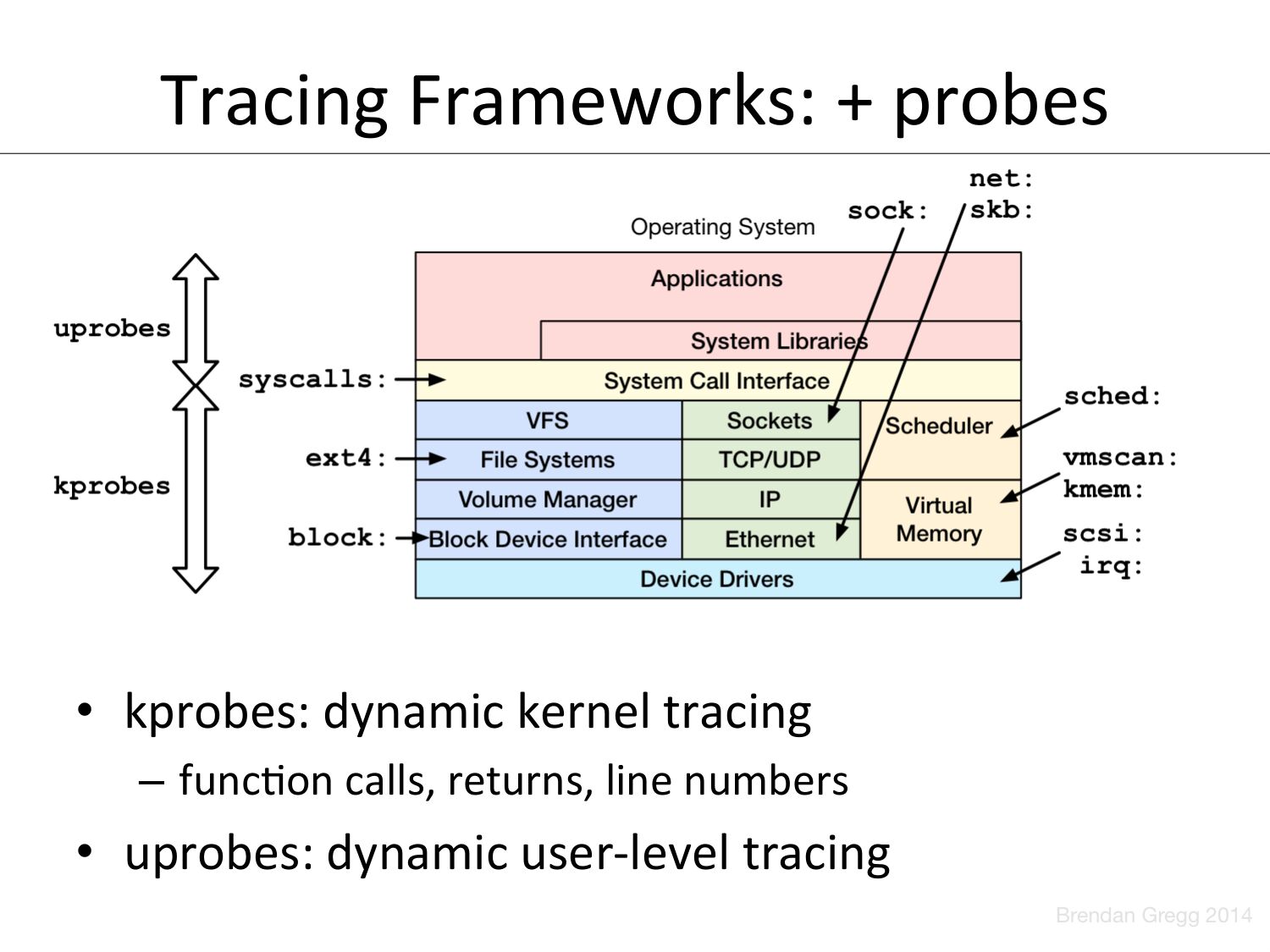 Tracing Frameworks: + probes • kprobes: dynamic kernel tracing – funcVon calls, returns, line numbers • uprobes: dynamic user-‐level tracingslide 63: