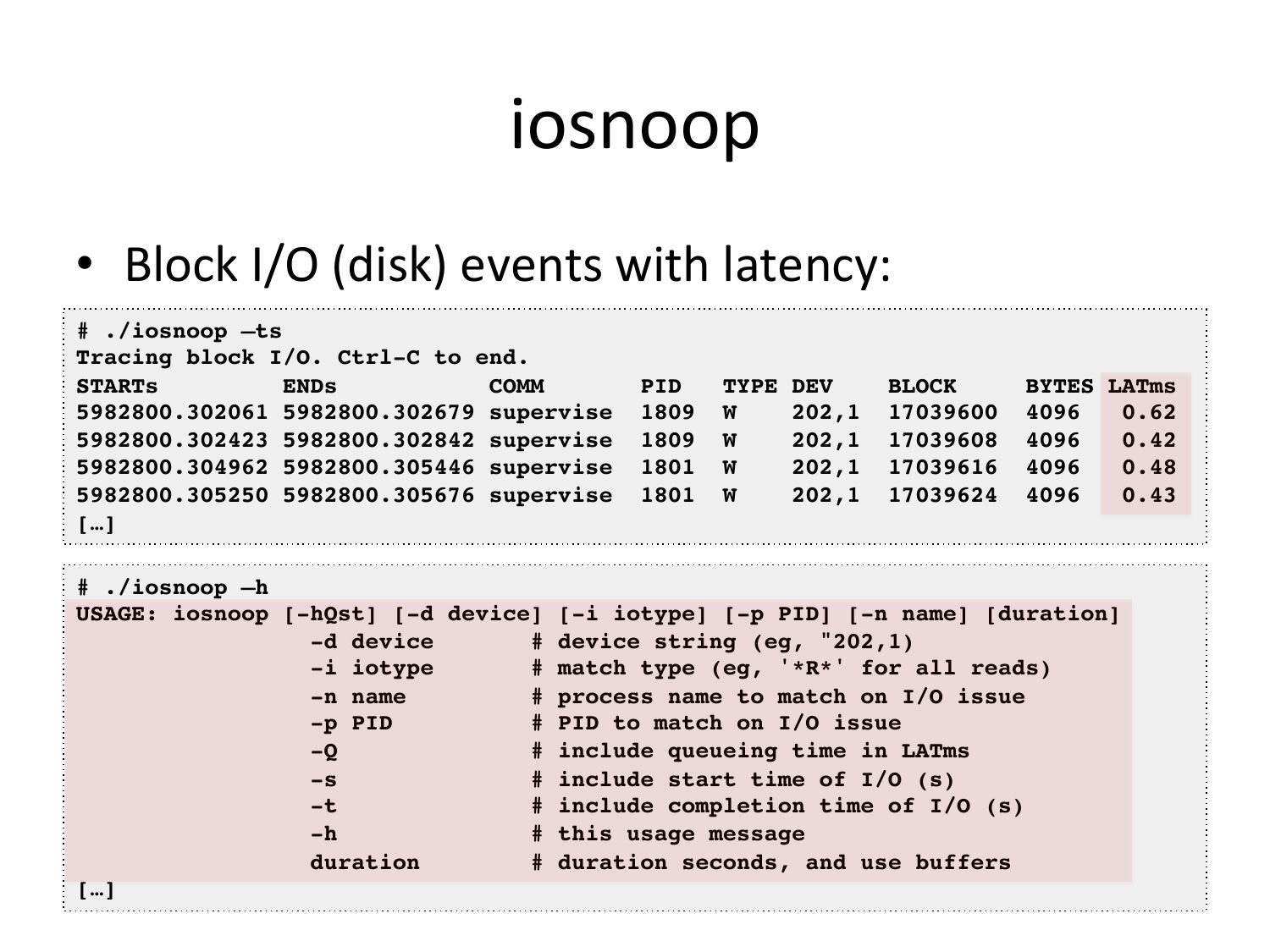 iosnoop • Block I/O (disk) events with latency: # ./iosnoop –ts! Tracing block I/O. Ctrl-C to end.! STARTs ENDs COMM 5982800.302061 5982800.302679 supervise 5982800.302423 5982800.302842 supervise 5982800.304962 5982800.305446 supervise 5982800.305250 5982800.305676 supervise […]! PID TYPE DEV 202,1 202,1 202,1 202,1 BLOCK BYTES LATms! 0.62! 0.42! 0.48! 0.43! # ./iosnoop –h! USAGE: iosnoop [-hQst] [-d device] [-i iotype] [-p PID] [-n name] [duration]! -d device # device string (eg, "202,1)! -i iotype # match type (eg, '*R*' for all reads)! -n name # process name to match on I/O issue! -p PID # PID to match on I/O issue! # include queueing time in LATms! # include start time of I/O (s)! # include completion time of I/O (s)! # this usage message! duration # duration seconds, and use buffers! […]!slide 66: