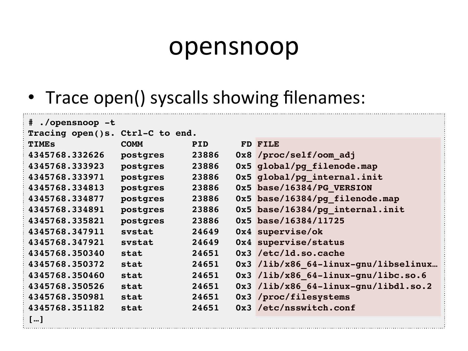 opensnoop • Trace open() syscalls showing filenames: # ./opensnoop -t! Tracing open()s. Ctrl-C to end.! TIMEs COMM PID postgres postgres postgres postgres postgres postgres postgres svstat svstat stat stat stat stat stat stat […]! FD FILE! 0x8 /proc/self/oom_adj! 0x5 global/pg_filenode.map! 0x5 global/pg_internal.init! 0x5 base/16384/PG_VERSION! 0x5 base/16384/pg_filenode.map! 0x5 base/16384/pg_internal.init! 0x5 base/16384/11725! 0x4 supervise/ok! 0x4 supervise/status! 0x3 /etc/ld.so.cache! 0x3 /lib/x86_64-linux-gnu/libselinux…! 0x3 /lib/x86_64-linux-gnu/libc.so.6! 0x3 /lib/x86_64-linux-gnu/libdl.so.2! 0x3 /proc/filesystems! 0x3 /etc/nsswitch.conf!slide 68: