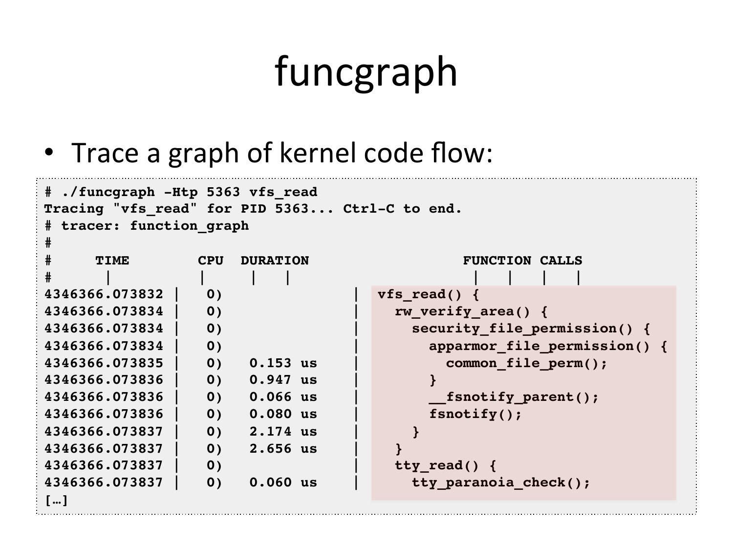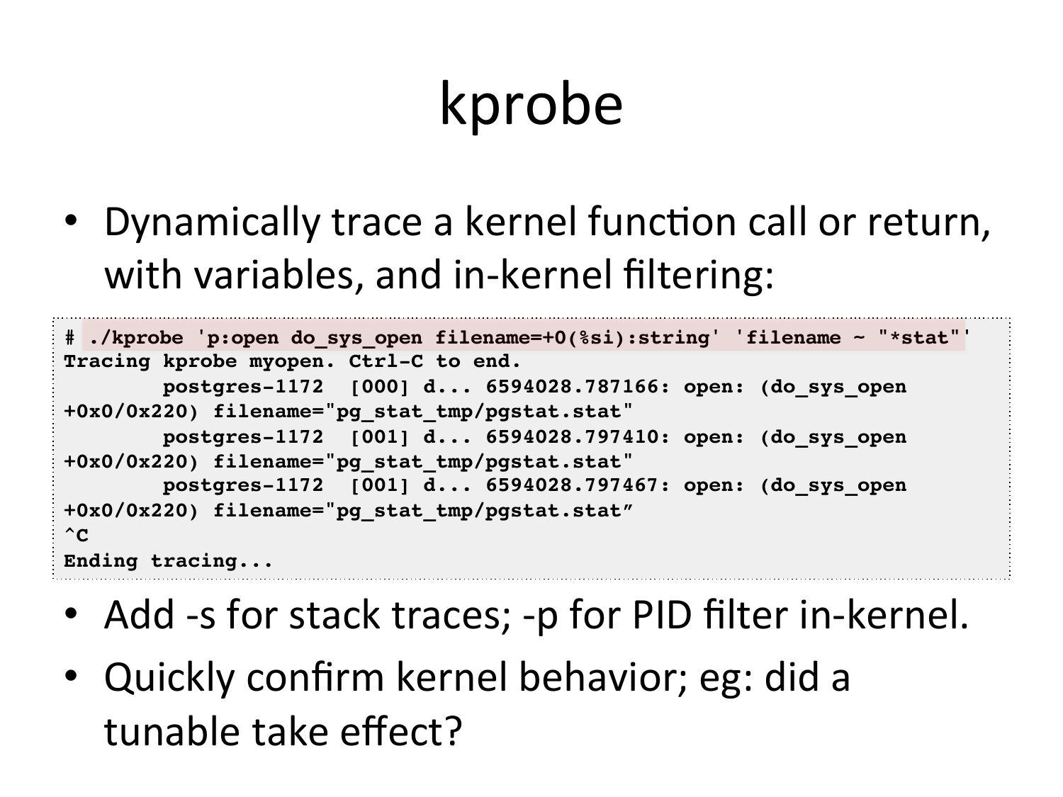 slide 69:kprobe • Dynamically trace a kernel funcVon call or return, with variables, and in-‐kernel filtering: # ./kprobe 'p:open do_sys_open filename=+0(%si):string' 'filename ~ "*stat"'! Tracing kprobe myopen. Ctrl-C to end.! postgres-1172 [000] d... 6594028.787166: open: (do_sys_open +0x0/0x220) filename="pg_stat_tmp/pgstat.stat"! postgres-1172 [001] d... 6594028.797410: open: (do_sys_open +0x0/0x220) filename="pg_stat_tmp/pgstat.stat"! postgres-1172 [001] d... 6594028.797467: open: (do_sys_open +0x0/0x220) filename="pg_stat_tmp/pgstat.stat”! ^C! Ending tracing...! • Add -‐s for stack traces; -‐p for PID filter in-‐kernel. • Quickly confirm kernel behavior; eg: did a tunable take effect?slide 70: