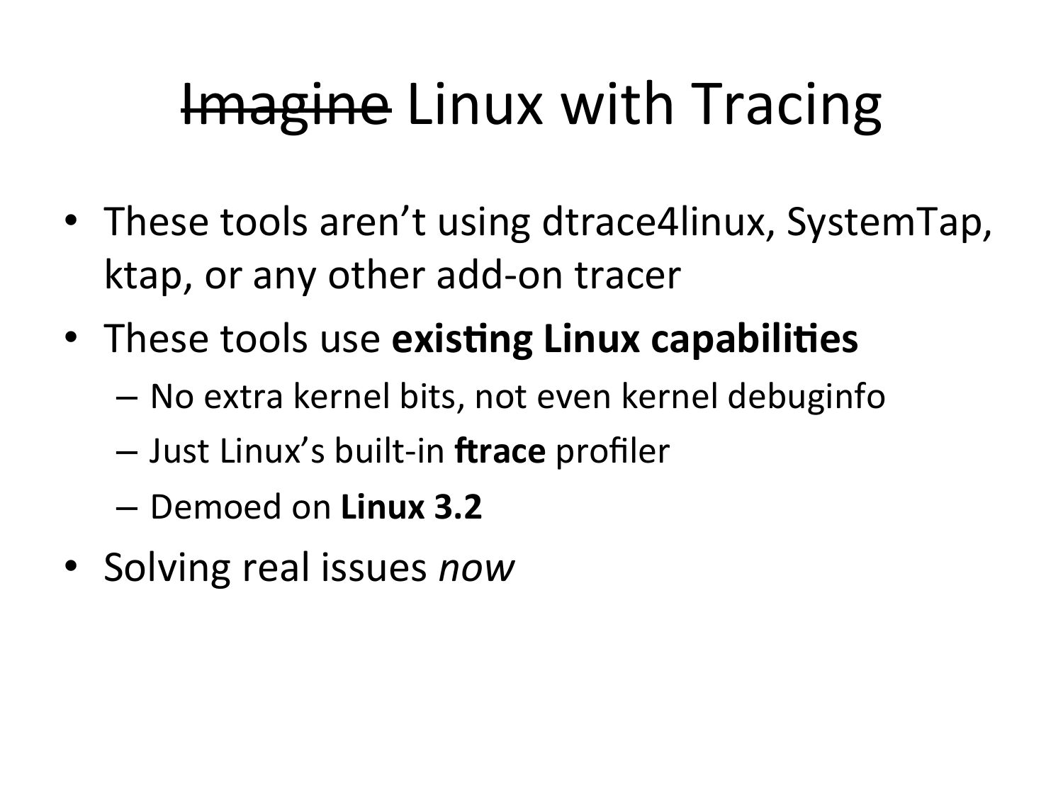 Imagine Linux with Tracing • These tools aren’t using dtrace4linux, SystemTap, ktap, or any other add-‐on tracer • These tools use exis.ng Linux capabili.es – No extra kernel bits, not even kernel debuginfo – Just Linux’s built-‐in 8race profiler – Demoed on Linux 3.2 • Solving real issues nowslide 71: