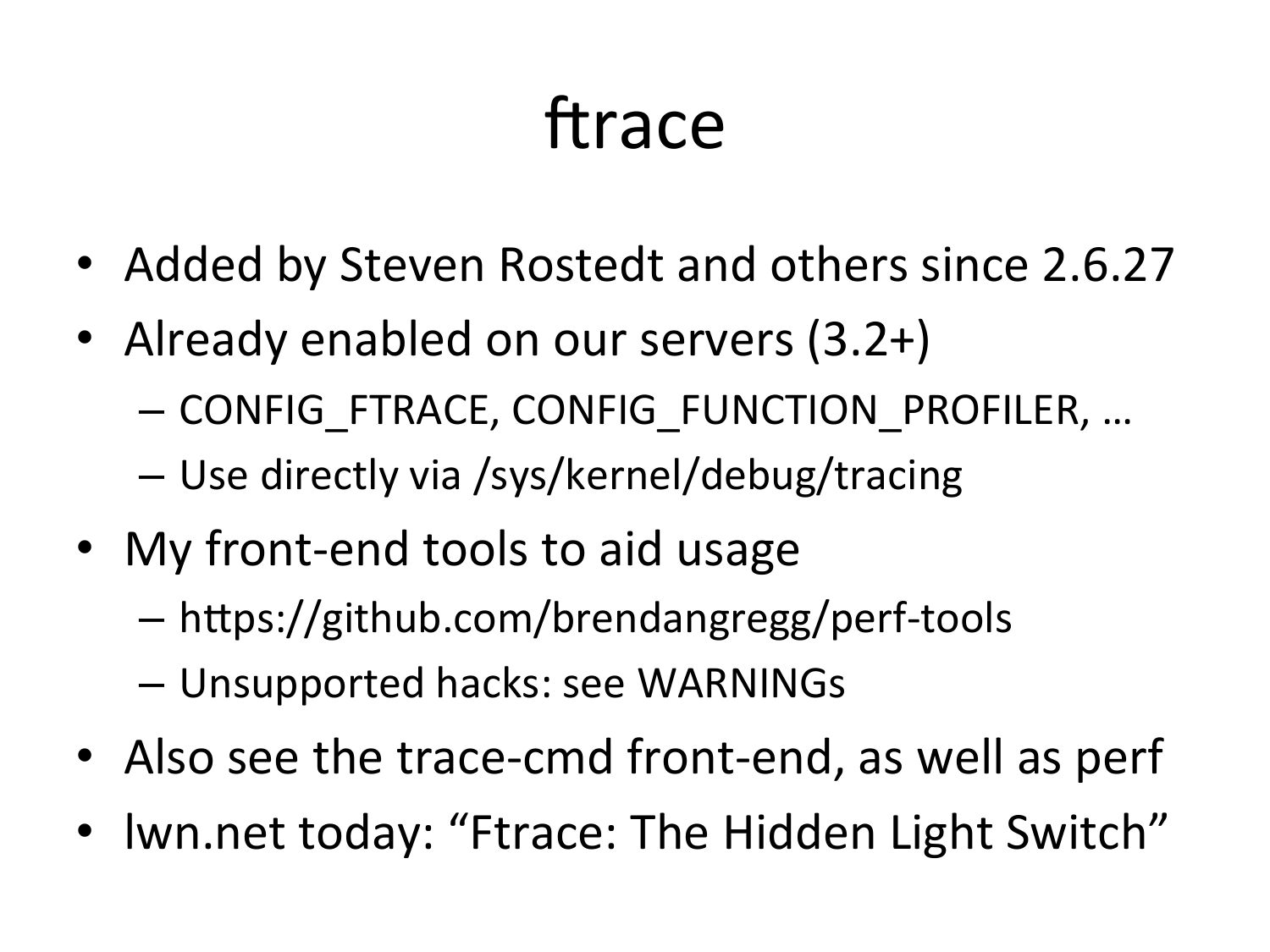 crace • Added by Steven Rostedt and others since 2.6.27 • Already enabled on our servers (3.2+) – CONFIG_FTRACE, CONFIG_FUNCTION_PROFILER, … – Use directly via /sys/kernel/debug/tracing • My front-‐end tools to aid usage – hkps://github.com/brendangregg/perf-‐tools – Unsupported hacks: see WARNINGs • Also see the trace-‐cmd front-‐end, as well as perf • lwn.net today: “Ftrace: The Hidden Light Switch”slide 72: