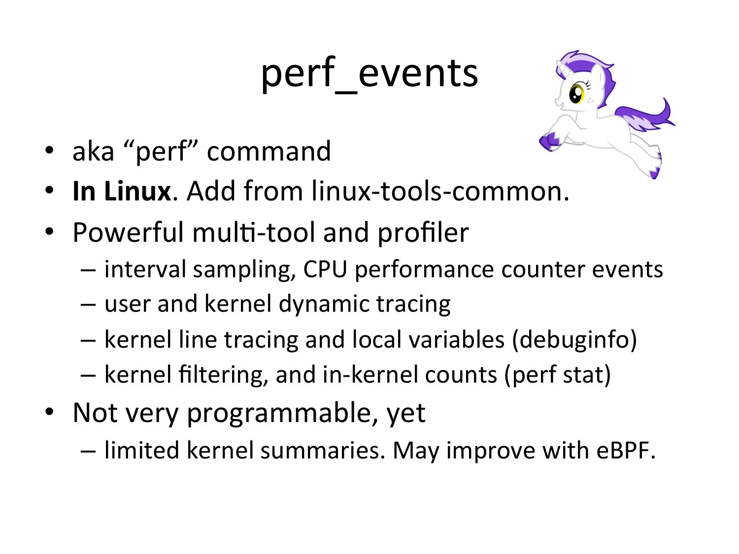 perf_events • aka “perf” command • In Linux. Add from linux-‐tools-‐common. • Powerful mulV-‐tool and profiler – interval sampling, CPU performance counter events – user and kernel dynamic tracing – kernel line tracing and local variables (debuginfo) – kernel filtering, and in-‐kernel counts (perf stat) • Not very programmable, yet – limited kernel summaries. May improve with eBPF.slide 75: