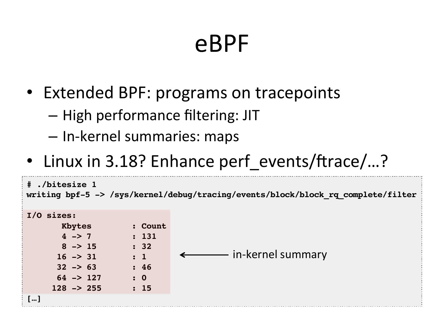 eBPF • Extended BPF: programs on tracepoints – High performance filtering: JIT – In-‐kernel summaries: maps • Linux in 3.18? Enhance perf_events/crace/…? # ./bitesize 1! writing bpf-5 ->gt; /sys/kernel/debug/tracing/events/block/block_rq_complete/filter! I/O sizes:! Kbytes : Count! 4 ->gt; 7 : 131! 8 ->gt; 15 : 32! in-‐kernel summary 16 ->gt; 31 : 1! 32 ->gt; 63 : 46! 64 ->gt; 127 : 0! 128 ->gt; 255 : 15! […]!slide 77: