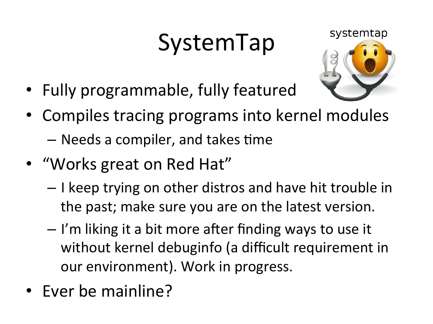 SystemTap • Fully programmable, fully featured • Compiles tracing programs into kernel modules – Needs a compiler, and takes Vme • “Works great on Red Hat” – I keep trying on other distros and have hit trouble in the past; make sure you are on the latest version. – I’m liking it a bit more acer finding ways to use it without kernel debuginfo (a difficult requirement in our environment). Work in progress. • Ever be mainline?slide 78: