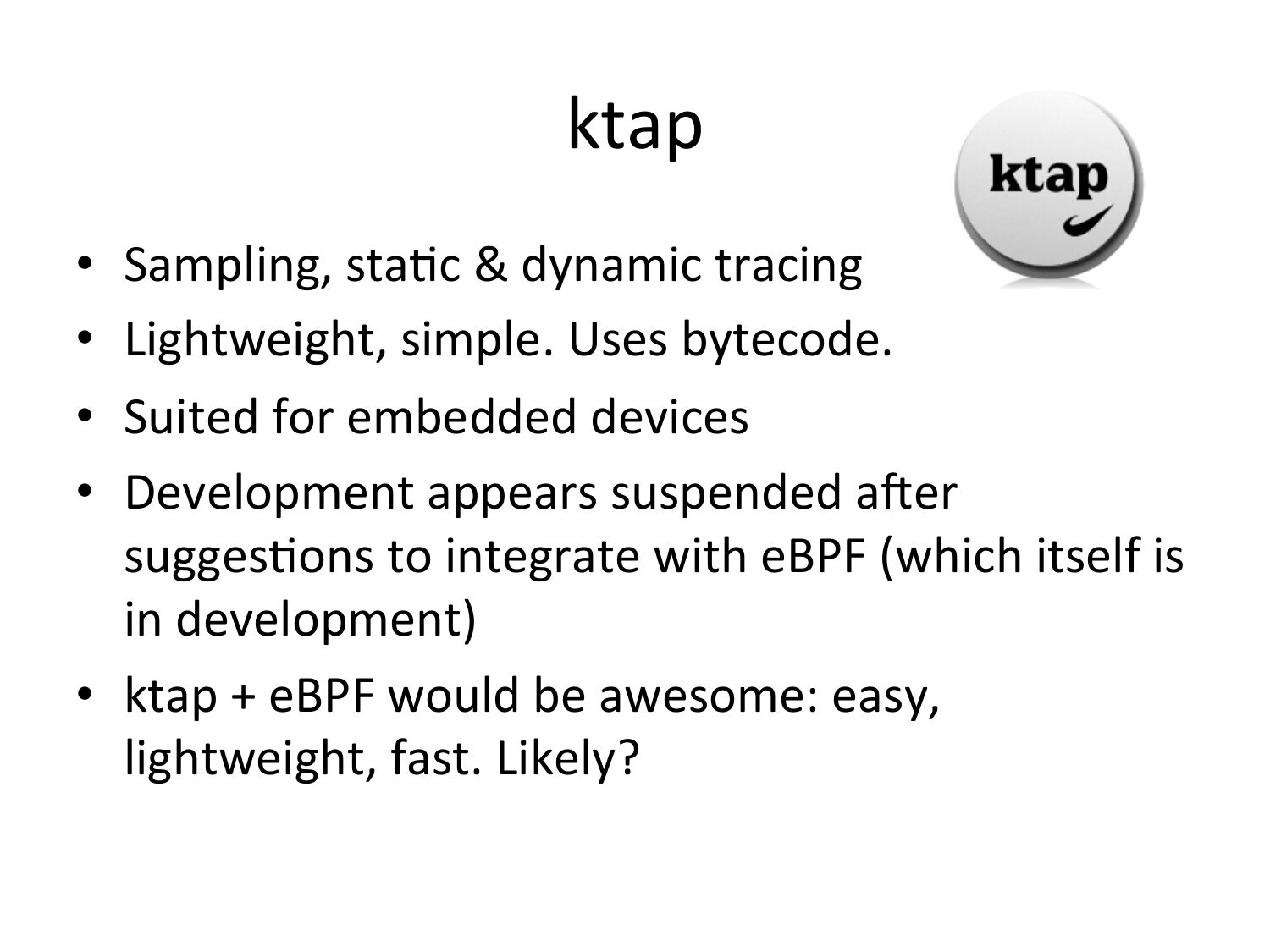 ktap • Sampling, staVc & dynamic tracing • Lightweight, simple. Uses bytecode. • Suited for embedded devices • Development appears suspended acer suggesVons to integrate with eBPF (which itself is in development) • ktap + eBPF would be awesome: easy, lightweight, fast. Likely?slide 79: