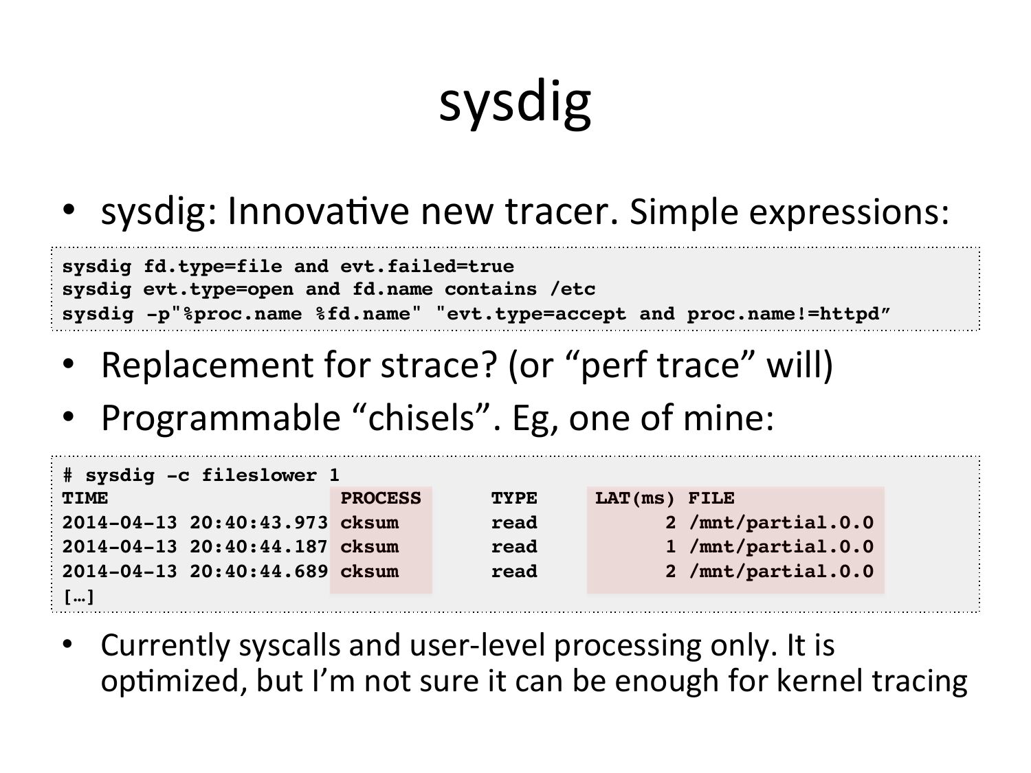 sysdig • sysdig: InnovaVve new tracer. Simple expressions: sysdig fd.type=file and evt.failed=true! sysdig evt.type=open and fd.name contains /etc! sysdig -p"%proc.name %fd.name" "evt.type=accept and proc.name!=httpd”! • Replacement for strace? (or “perf trace” will) • Programmable “chisels”. Eg, one of mine: # sysdig -c fileslower 1! TIME PROCESS 2014-04-13 20:40:43.973 cksum 2014-04-13 20:40:44.187 cksum 2014-04-13 20:40:44.689 cksum […]! TYPE read read read LAT(ms) FILE! 2 /mnt/partial.0.0! 1 /mnt/partial.0.0! 2 /mnt/partial.0.0! • Currently syscalls and user-‐level processing only. It is opVmized, but I’m not sure it can be enough for kernel tracingslide 80: