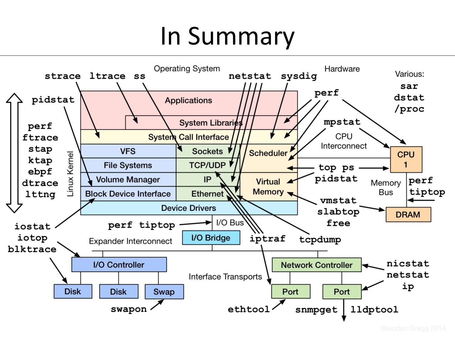 Talk at LinuxCon North America 2014, by Brendan Gregg.Description: "There are many performance tools nowadays for Linux, but how do they all fit together, and when do we use them? This talk summarizes the three types of performance tools: observability, benchmarking, and tuning, providing a tour of what exists and why they exist. Advanced tools including those based on tracepoints, kprobes, and uprobes are also included: perf_events, ktap, SystemTap, LTTng, and sysdig. You'll gain a good understanding of the performance tools landscape, knowing what to reach for to get the most out of your systems."