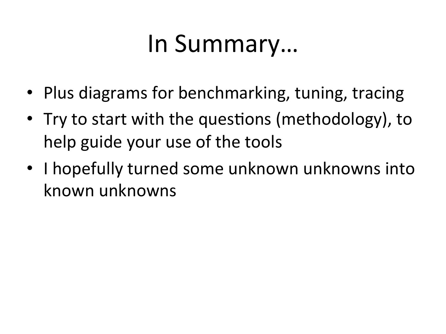 In Summary… • Plus diagrams for benchmarking, tuning, tracing • Try to start with the quesVons (methodology), to help guide your use of the tools • I hopefully turned some unknown unknowns into known unknownsslide 84:
