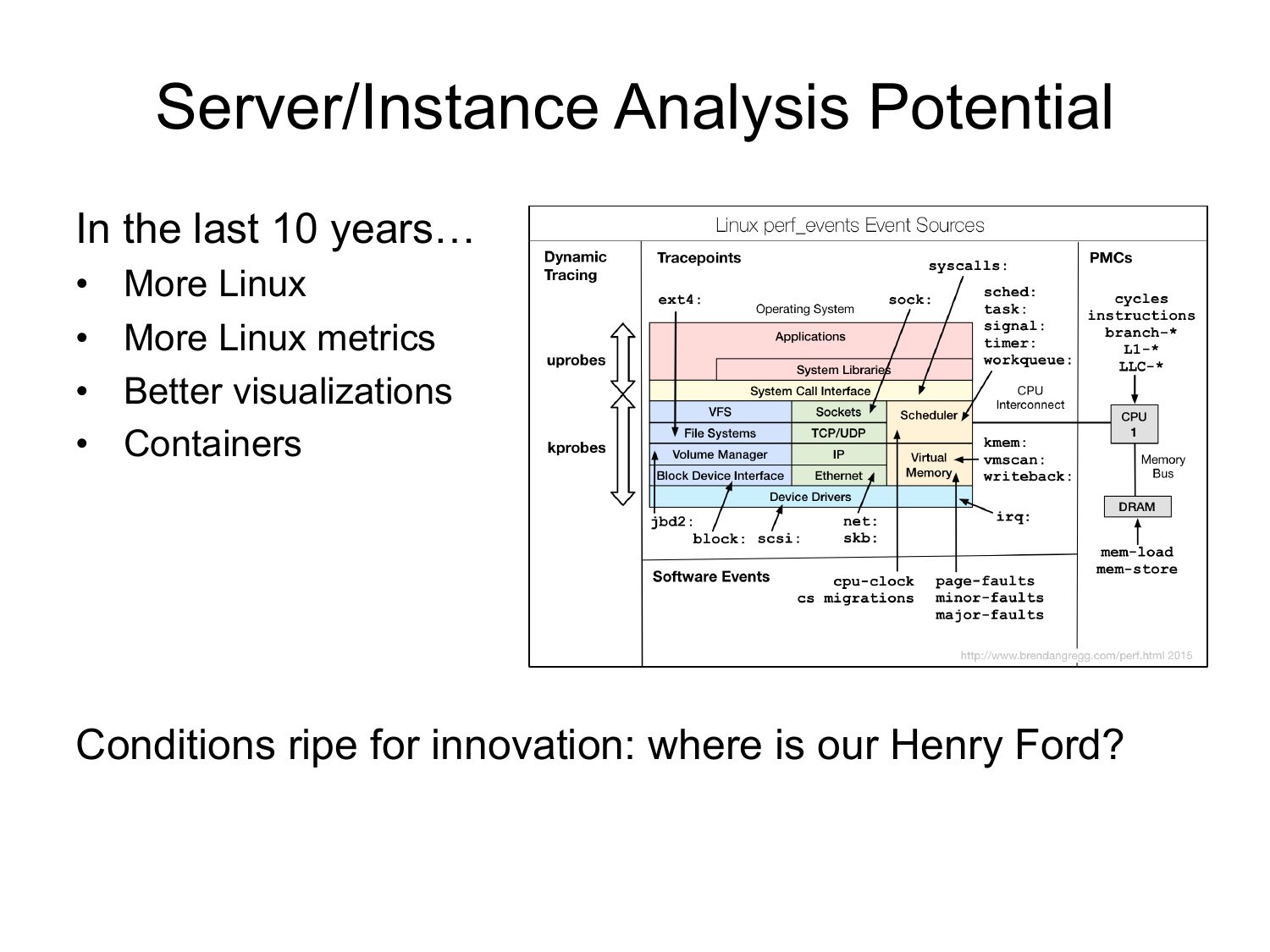 Server/Instance Analysis Potential In the last 10 years… More Linux More Linux metrics Better visualizations Containers Conditions ripe for innovation: where is our Henry Ford?slide 4: