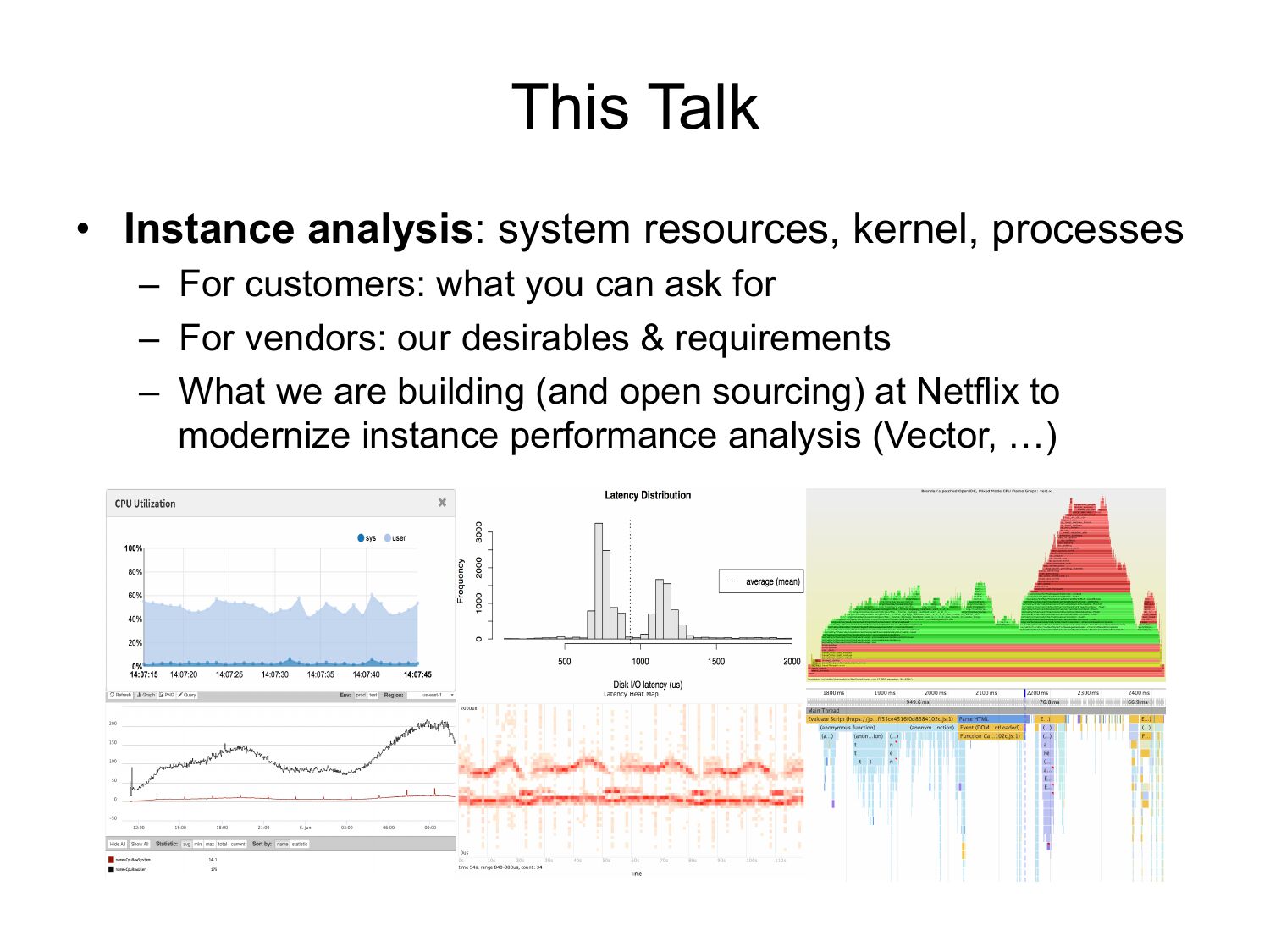 This Talk • Instance analysis: system resources, kernel, processes – For customers: what you can ask for – For vendors: our desirables & requirements – What we are building (and open sourcing) at Netflix to modernize instance performance analysis (Vector, …)slide 5:
