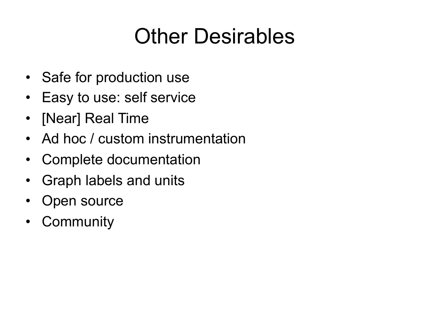 Other Desirables Safe for production use Easy to use: self service [Near] Real Time Ad hoc / custom instrumentation Complete documentation Graph labels and units Open source Communityslide 23:
