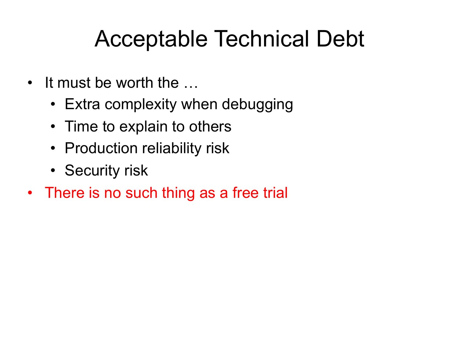 Acceptable Technical Debt • It must be worth the … • Extra complexity when debugging • Time to explain to others • Production reliability risk • Security risk • There is no such thing as a free trialslide 31: