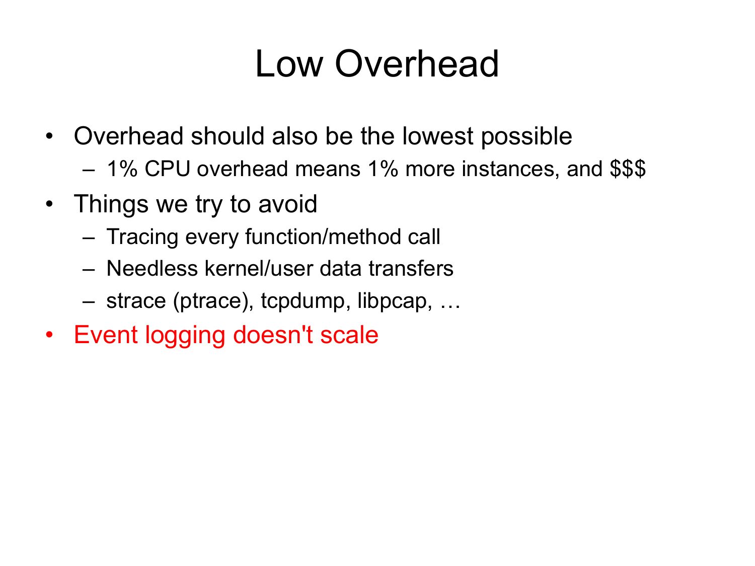 Low Overhead • Overhead should also be the lowest possible – 1% CPU overhead means 1% more instances, and $$$ • Things we try to avoid – Tracing every function/method call – Needless kernel/user data transfers – strace (ptrace), tcpdump, libpcap, … • Event logging doesn't scaleslide 33: