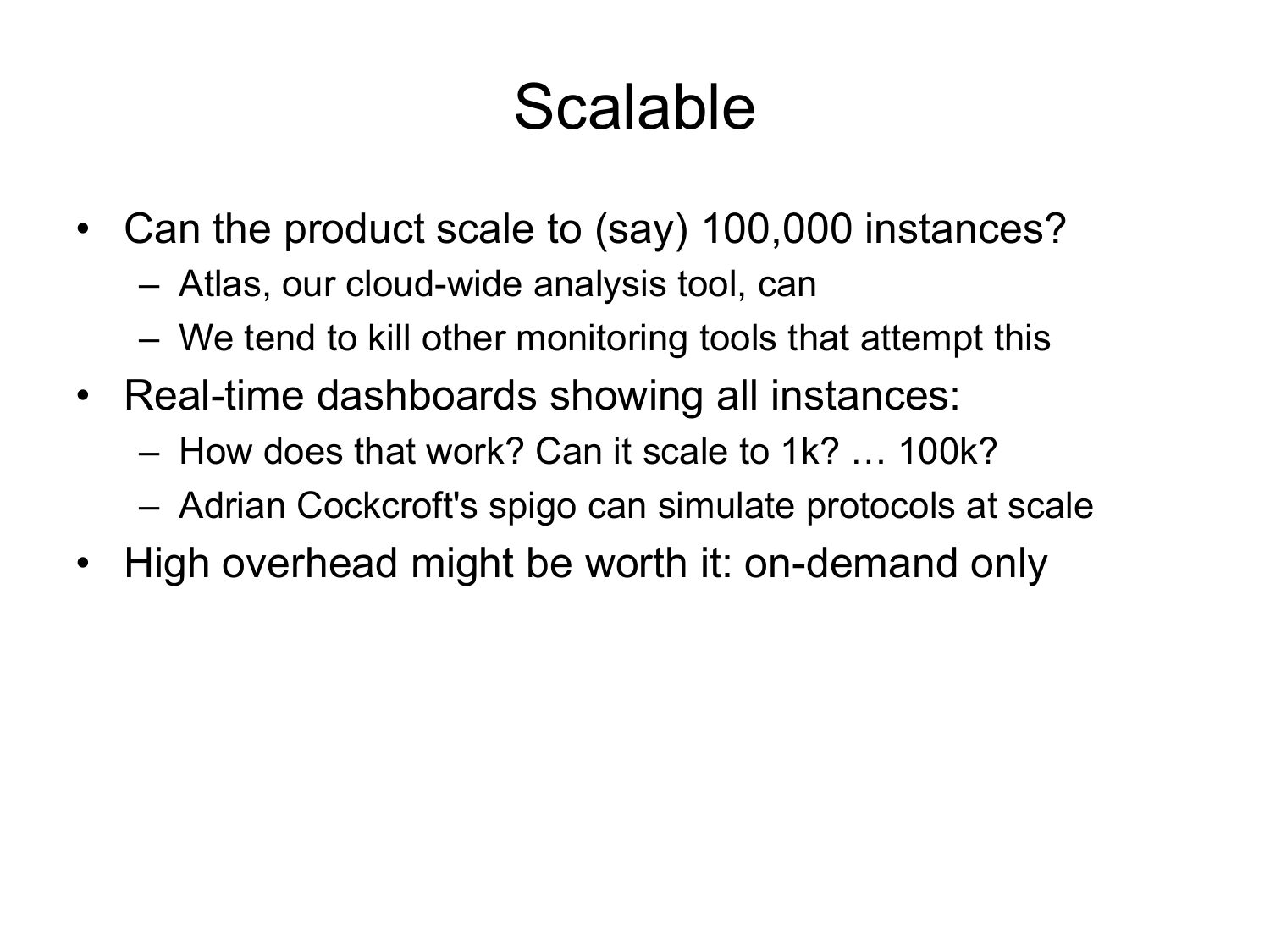 Scalable • Can the product scale to (say) 100,000 instances? – Atlas, our cloud-wide analysis tool, can – We tend to kill other monitoring tools that attempt this • Real-time dashboards showing all instances: – How does that work? Can it scale to 1k? … 100k? – Adrian Cockcroft's spigo can simulate protocols at scale • High overhead might be worth it: on-demand onlyslide 34: