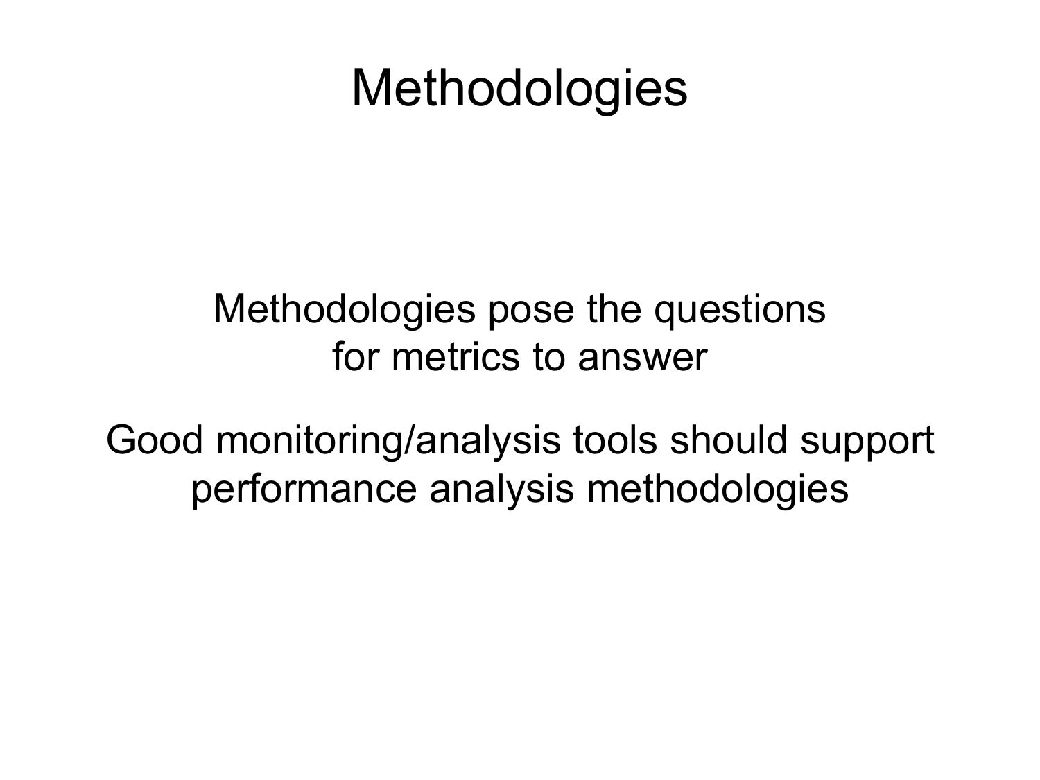 Methodologies Methodologies pose the questions for metrics to answer Good monitoring/analysis tools should support performance analysis methodologiesslide 37: