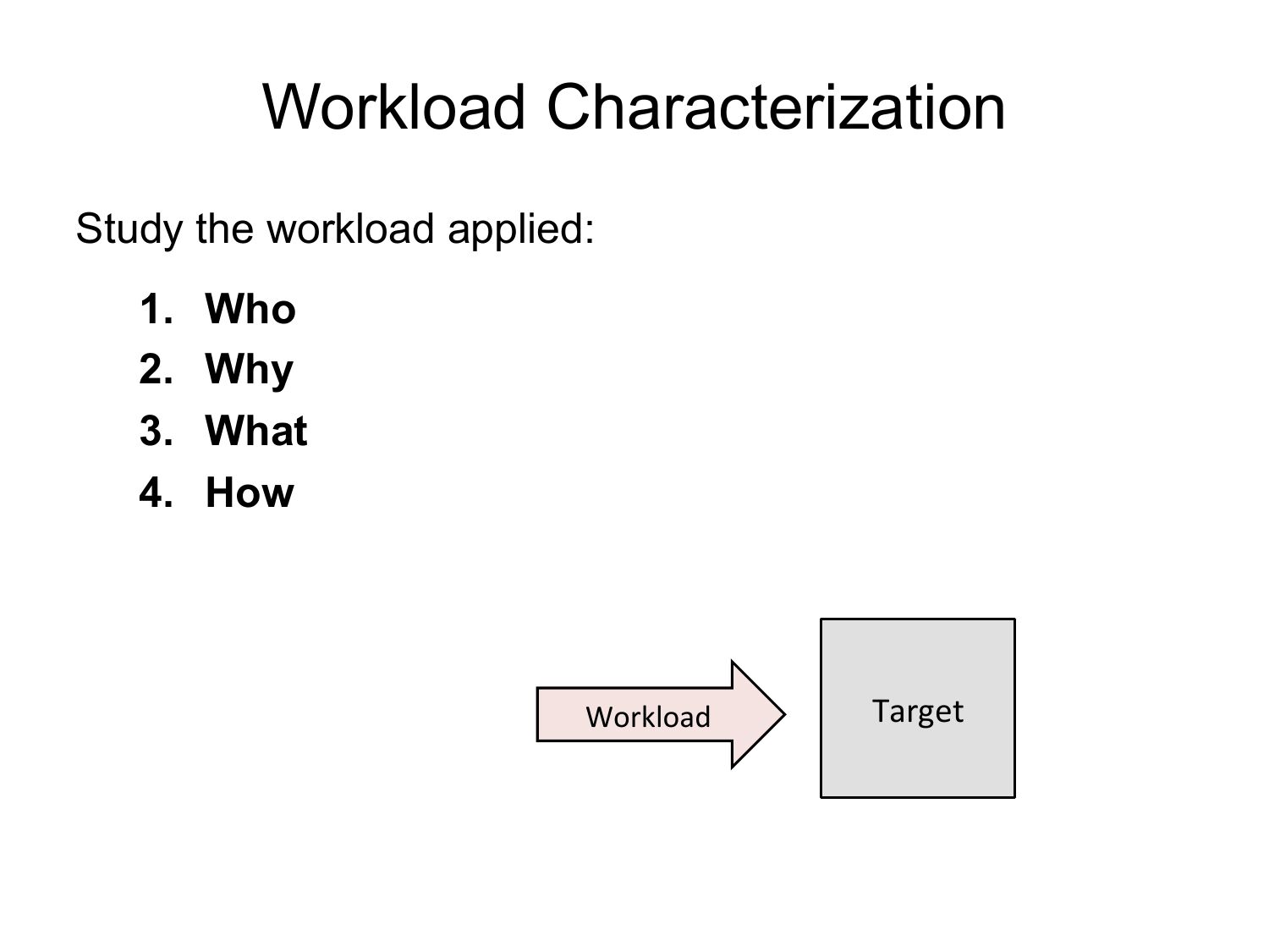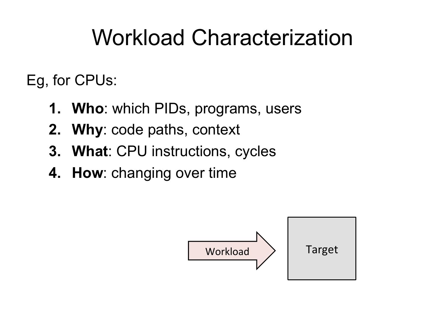 Workload Characterization Eg, for CPUs: Who: which PIDs, programs, users Why: code paths, context What: CPU instructions, cycles How: changing over time Workload Targetslide 40:
