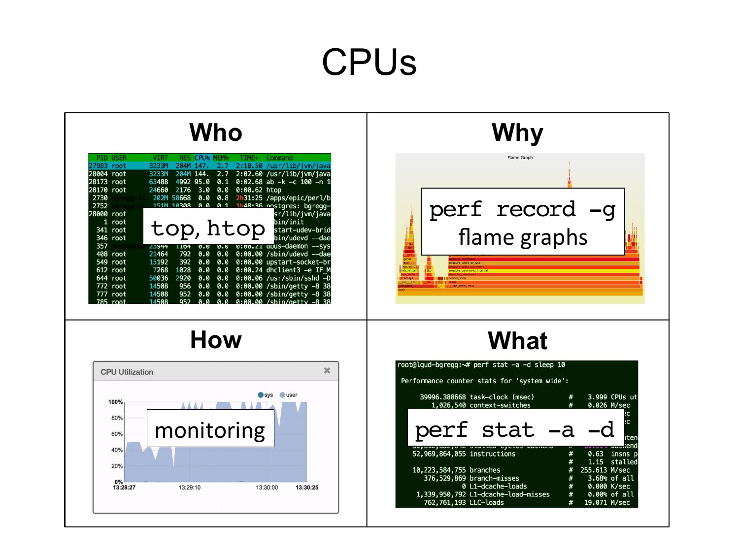 CPUs Who Why top, htop! perf record -g! flame graphs How What monitoring perf stat -a -d!slide 42: