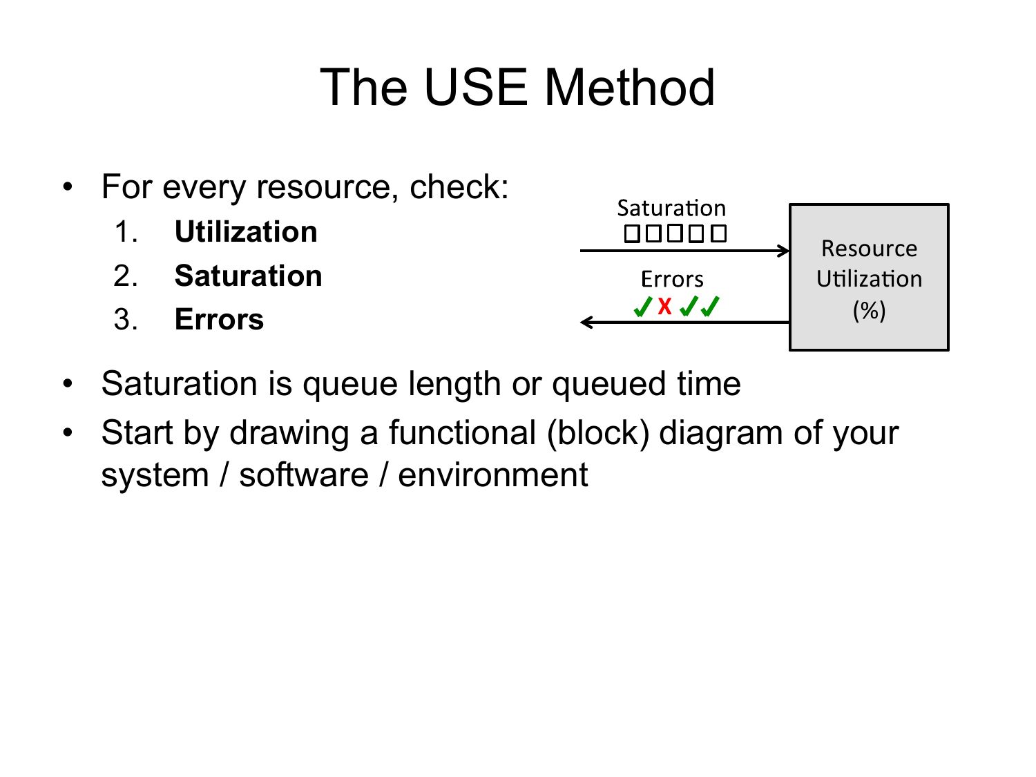 The USE Method • For every resource, check: Utilization Saturation Errors X Resource UFlizaFon (%) • Saturation is queue length or queued time • Start by drawing a functional (block) diagram of your system / software / environmentslide 44: