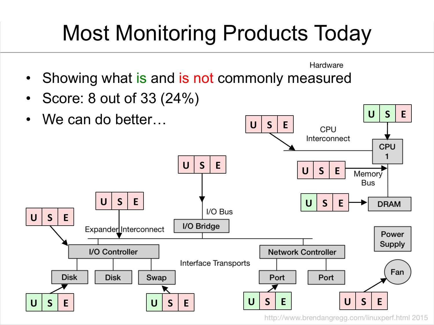 Most Monitoring Products Today • Showing what is and is not commonly measured • Score: 8 out of 33 (24%) • We can do better… U S E U S E U S E U S E U S E U S E U S E U S E U S E U S E U S Eslide 47: