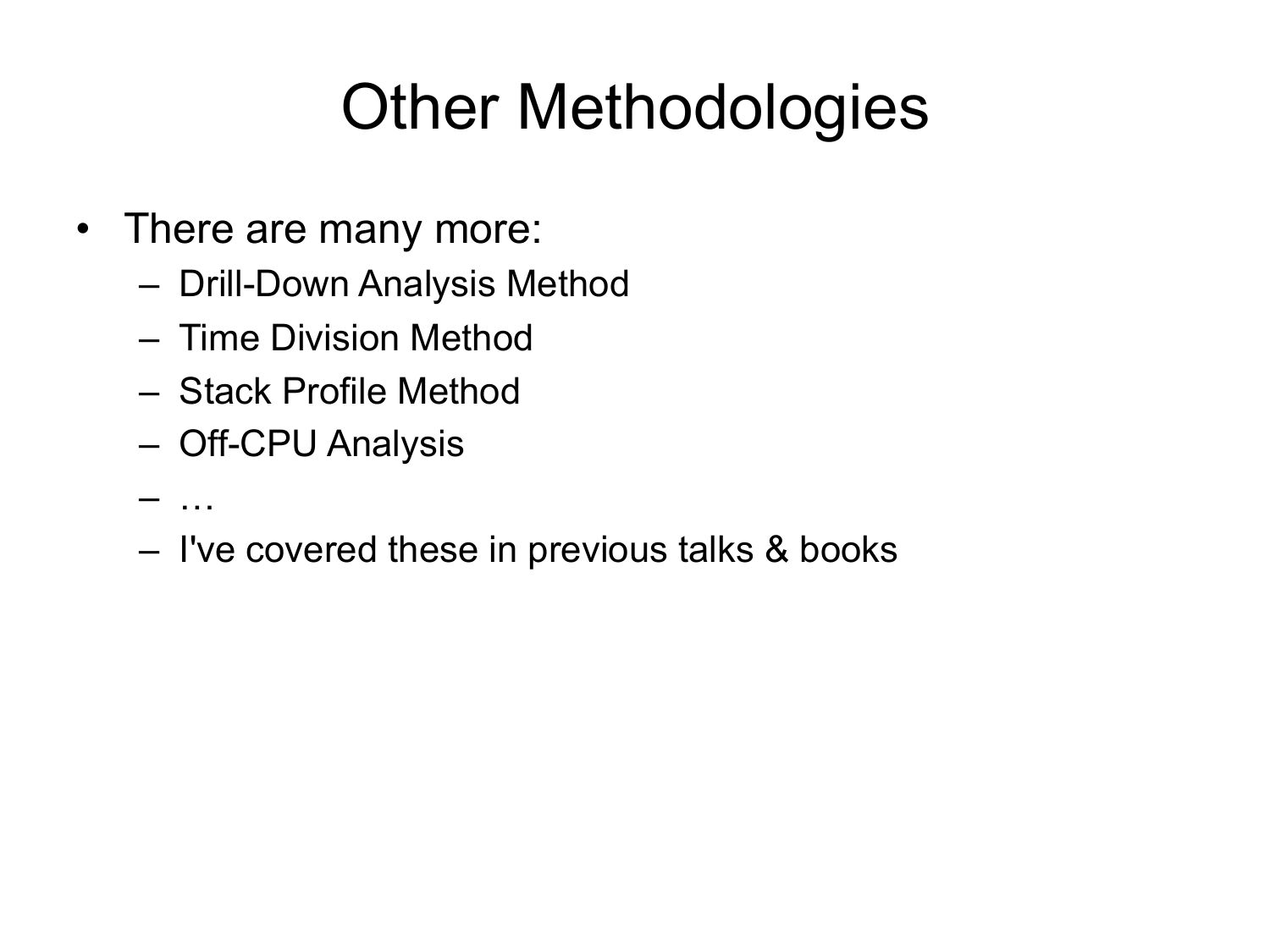 Other Methodologies • There are many more: – Drill-Down Analysis Method – Time Division Method – Stack Profile Method – Off-CPU Analysis – … – I've covered these in previous talks & booksslide 48: