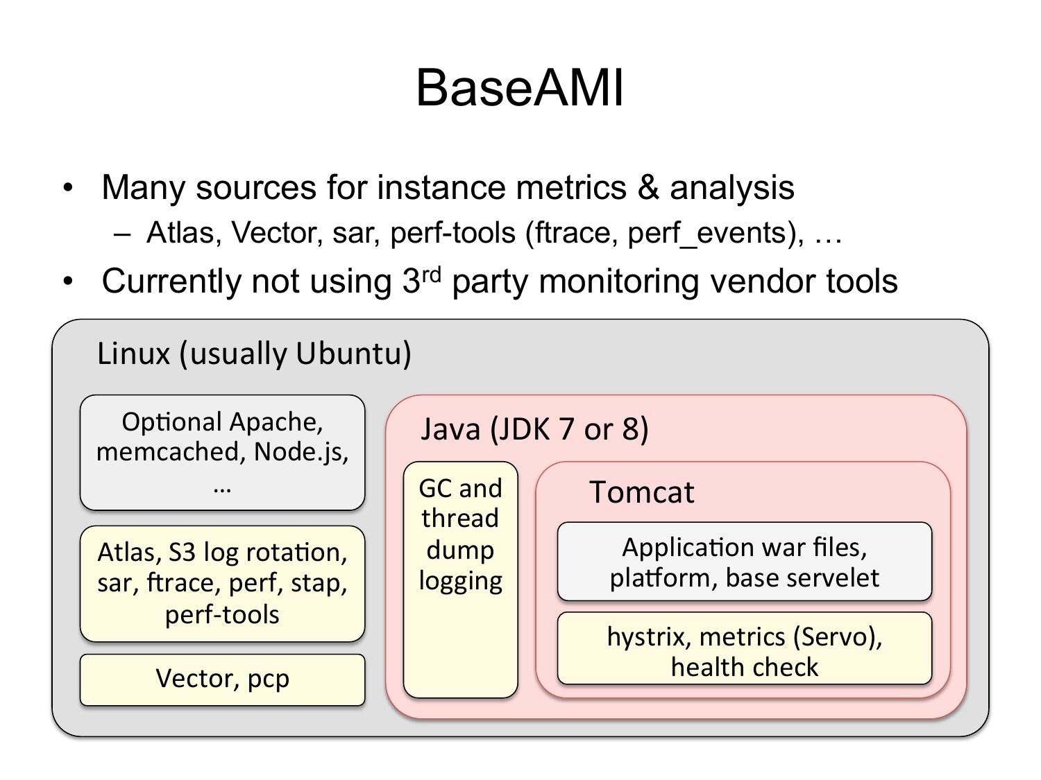 BaseAMI • Many sources for instance metrics & analysis – Atlas, Vector, sar, perf-tools (ftrace, perf_events), … • Currently not using 3rd party monitoring vendor tools Linux (usually Ubuntu) OpFonal Apache, memcached, Node.js, … Atlas, S3 log rotaFon, sar, erace, perf, stap, perf-‐tools Vector, pcp Java (JDK 7 or 8) GC and thread dump logging Tomcat ApplicaFon war files, plahorm, base servelet hystrix, metrics (Servo), health checkslide 50: