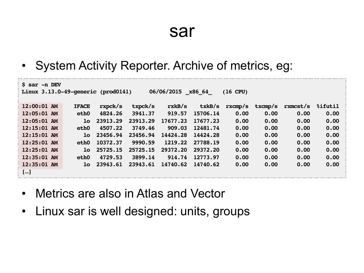 sar • System Activity Reporter. Archive of metrics, eg: $ sar -n DEV! Linux 3.13.0-49-generic (prod0141) !06/06/2015 !_x86_64_ !(16 CPU)! 12:00:01 AM IFACE rxpck/s txpck/s rxkB/s txkB/s rxcmp/s txcmp/s 12:05:01 AM eth0 919.57 15706.14 12:05:01 AM lo 23913.29 23913.29 17677.23 17677.23 12:15:01 AM eth0 909.03 12481.74 12:15:01 AM lo 23456.94 23456.94 14424.28 14424.28 12:25:01 AM eth0 10372.37 1219.22 27788.19 12:25:01 AM lo 25725.15 25725.15 29372.20 29372.20 12:35:01 AM eth0 914.74 12773.97 12:35:01 AM lo 23943.61 23943.61 14740.62 14740.62 […]! • Metrics are also in Atlas and Vector • Linux sar is well designed: units, groups rxmcst/s %ifutil! 0.00! 0.00! 0.00! 0.00! 0.00! 0.00! 0.00! 0.00!slide 57: