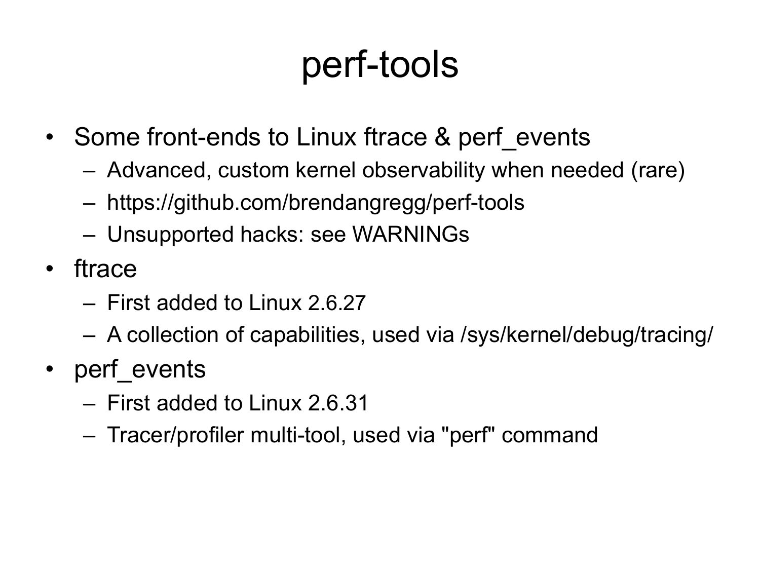 perf-tools • Some front-ends to Linux ftrace & perf_events – Advanced, custom kernel observability when needed (rare) – https://github.com/brendangregg/perf-tools – Unsupported hacks: see WARNINGs • ftrace – First added to Linux 2.6.27 – A collection of capabilities, used via /sys/kernel/debug/tracing/ • perf_events – First added to Linux 2.6.31 – Tracer/profiler multi-tool, used via "perf" commandslide 59: