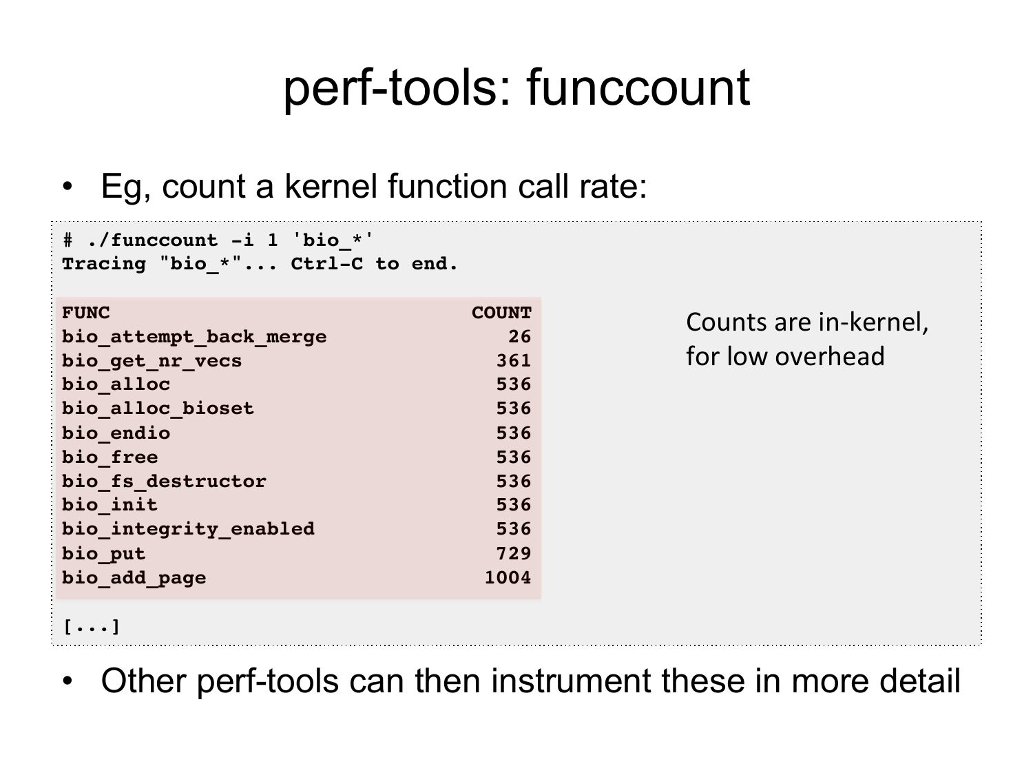 perf-tools: funccount • Eg, count a kernel function call rate: # ./funccount -i 1 'bio_*'! Tracing "bio_*"... Ctrl-C to end.! FUNC COUNT! bio_attempt_back_merge 26! bio_get_nr_vecs 361! bio_alloc 536! bio_alloc_bioset 536! bio_endio 536! bio_free 536! bio_fs_destructor 536! bio_init 536! bio_integrity_enabled 536! bio_put 729! bio_add_page 1004! [...]! Counts are in-‐kernel, for low overhead • Other perf-tools can then instrument these in more detailslide 60: