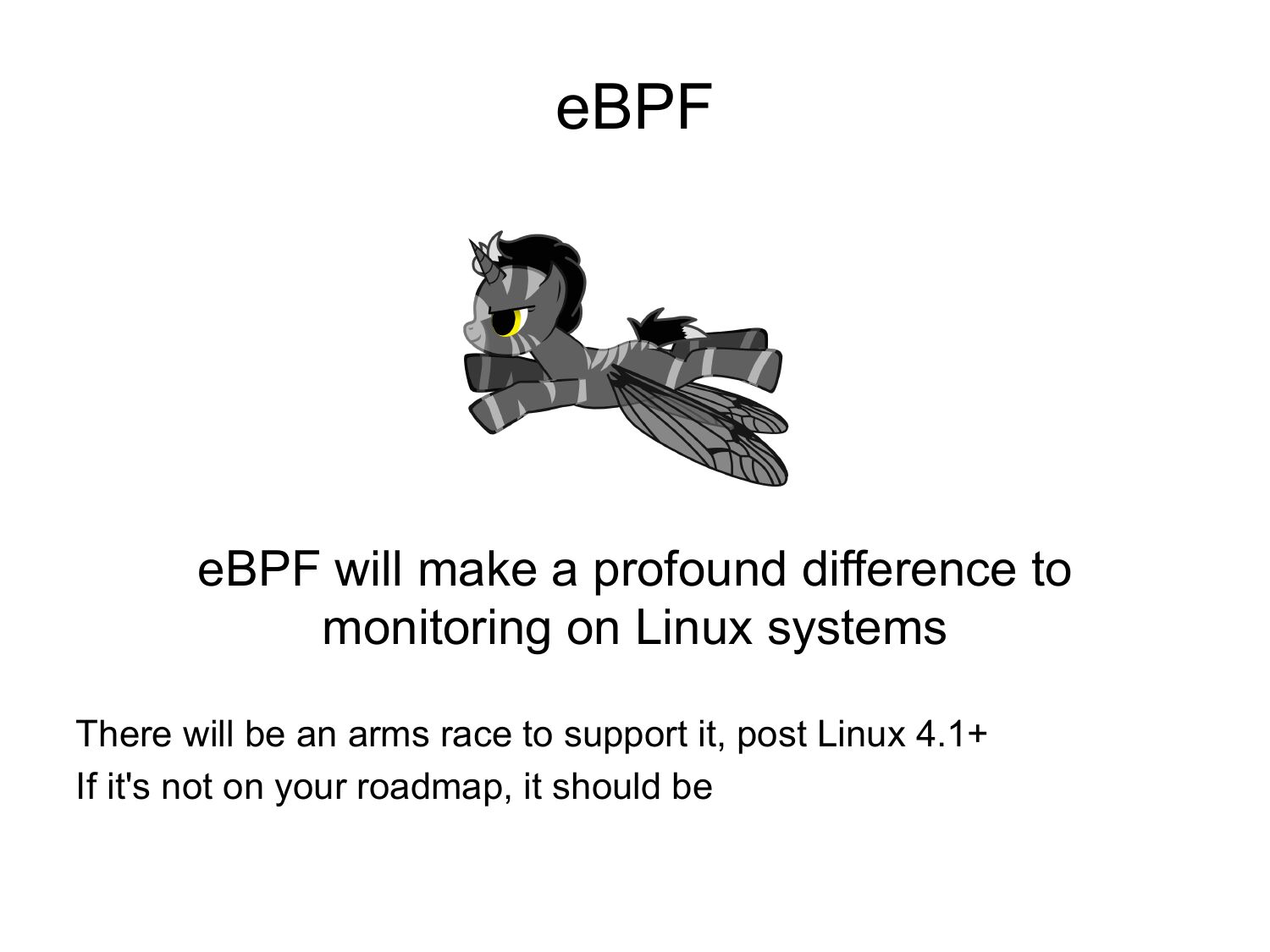 eBPF eBPF will make a profound difference to monitoring on Linux systems There will be an arms race to support it, post Linux 4.1+ If it's not on your roadmap, it should beslide 63: