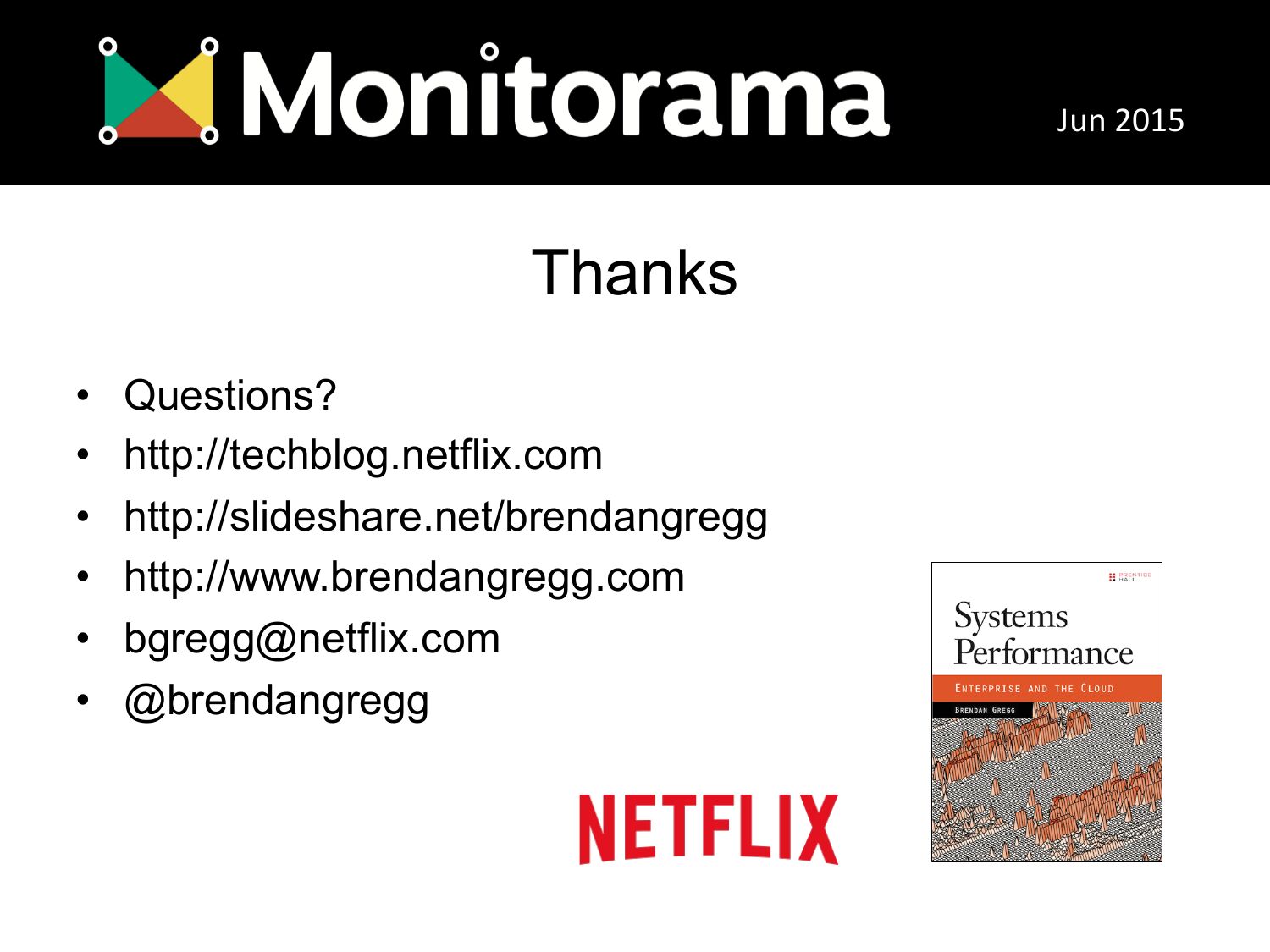 Jun 2015 Thanks Questions? http://techblog.netflix.com http://slideshare.net/brendangregg http://www.brendangregg.com bgregg@netflix.com @brendangregg