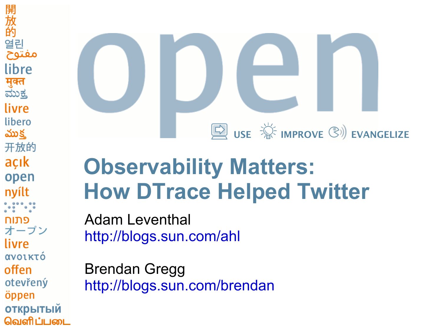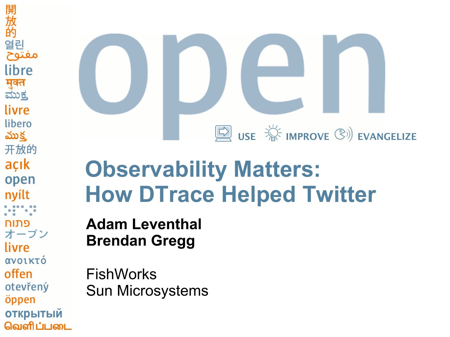 USE IMPROVE EVANGELIZE Observability Matters: How DTrace Helped Twitter Adam Leventhal Brendan Gregg FishWorks Sun Microsystemsslide 2: