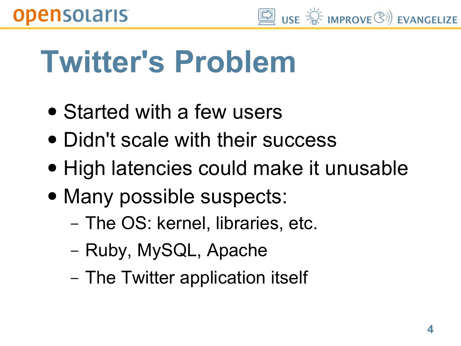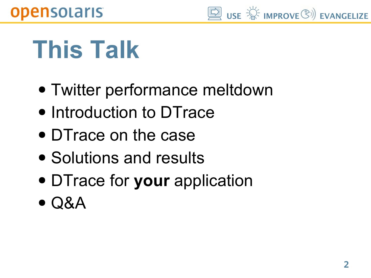 USE IMPROVE EVANGELIZE This Talk ● Twitter performance meltdown ● Introduction to DTrace ● DTrace on the case ● Solutions and results ● DTrace for your application ● Q&Aslide 3: