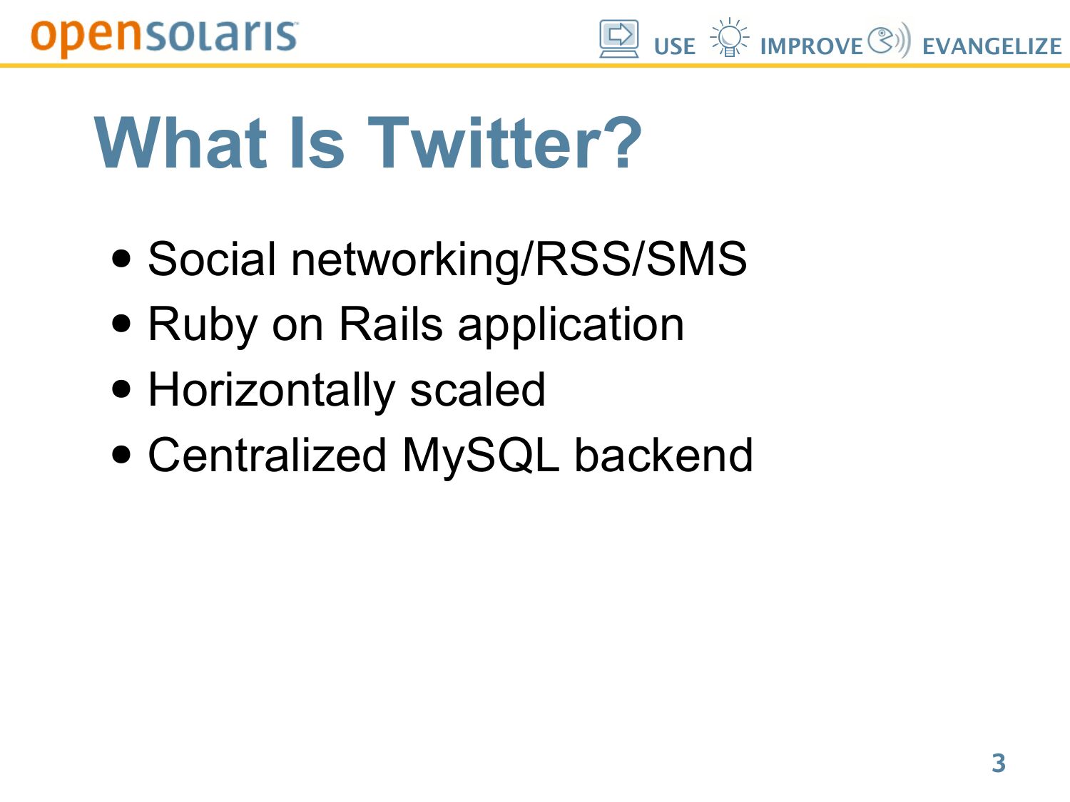 USE IMPROVE EVANGELIZE What Is Twitter? ● Social networking/RSS/SMS ● Ruby on Rails application ● Horizontally scaled ● Centralized MySQL backendslide 4: