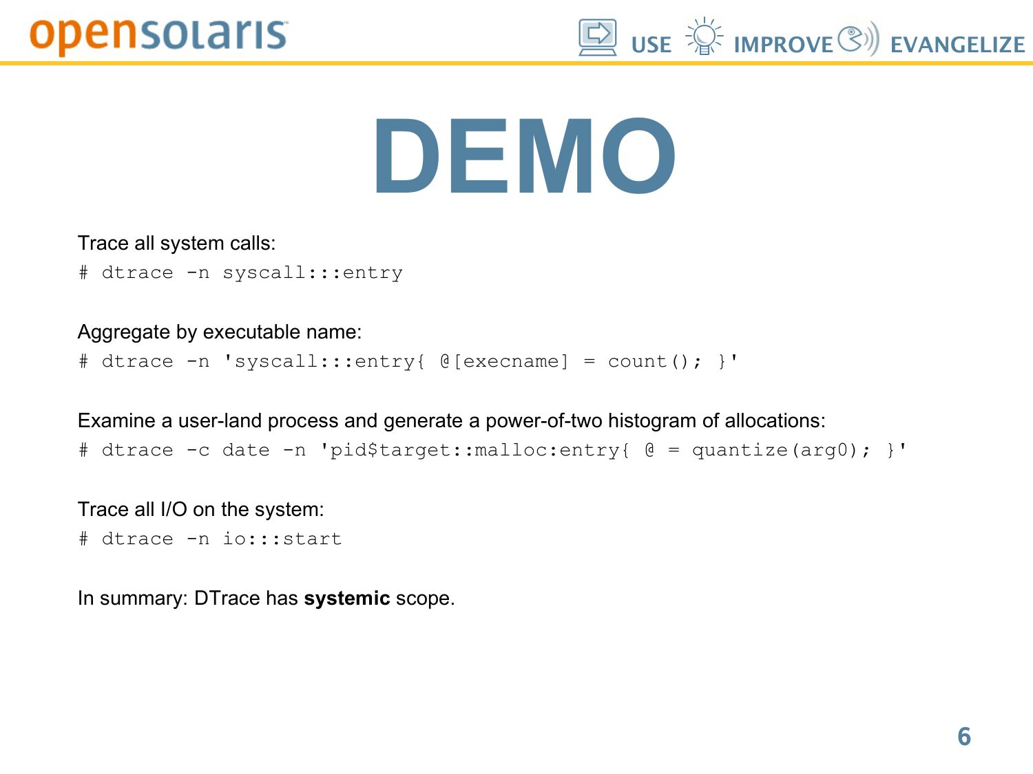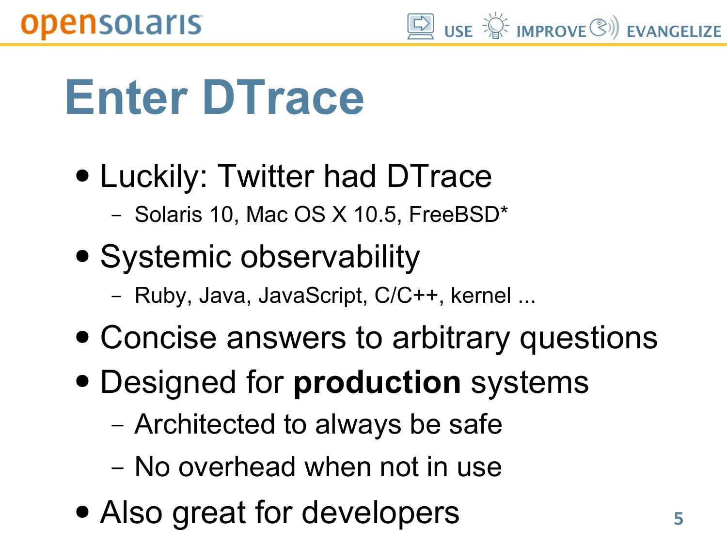 USE IMPROVE EVANGELIZE Enter DTrace ● Luckily: Twitter had DTrace Solaris 10, Mac OS X 10.5, FreeBSD* ● Systemic observability Ruby, Java, JavaScript, C/C++, kernel ... ● Concise answers to arbitrary questions ● Designed for production systems – Architected to always be safe – No overhead when not in use ● Also great for developersslide 6: