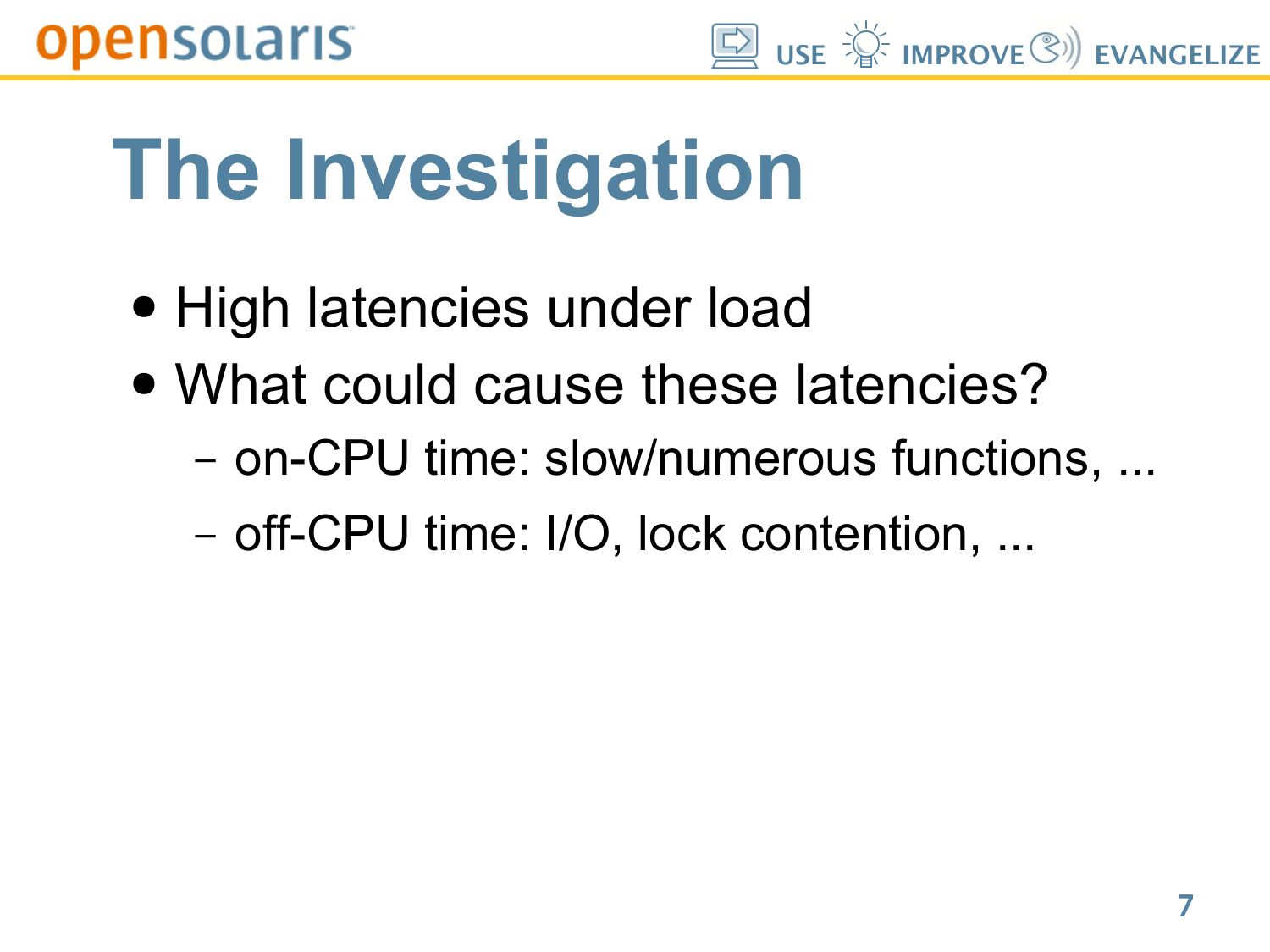 slide 7:USE IMPROVE EVANGELIZE The Investigation ● High latencies under load ● What could cause these latencies? – on-CPU time: slow/numerous functions, ... – off-CPU time: I/O, lock contention, ...slide 8: