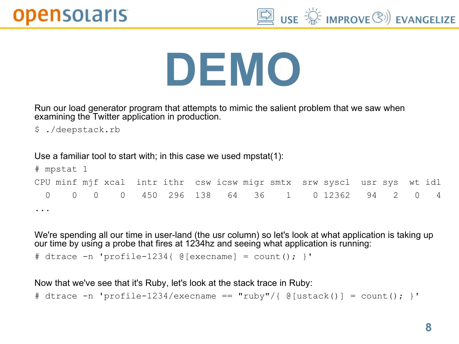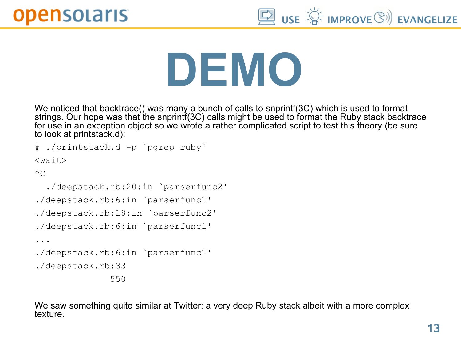 USE IMPROVE EVANGELIZE DEMO We noticed that backtrace() was many a bunch of calls to snprintf(3C) which is used to format strings. Our hope was that the snprintf(3C) calls might be used to format the Ruby stack backtrace for use in an exception object so we wrote a rather complicated script to test this theory (be sure to look at printstack.d): # ./printstack.d -p `pgrep ruby`slide 14:gt; ./deepstack.rb:20:in `parserfunc2' ./deepstack.rb:6:in `parserfunc1' ./deepstack.rb:18:in `parserfunc2' ./deepstack.rb:6:in `parserfunc1' ./deepstack.rb:6:in `parserfunc1' ./deepstack.rb:33 We saw something quite similar at Twitter: a very deep Ruby stack albeit with a more complex texture.