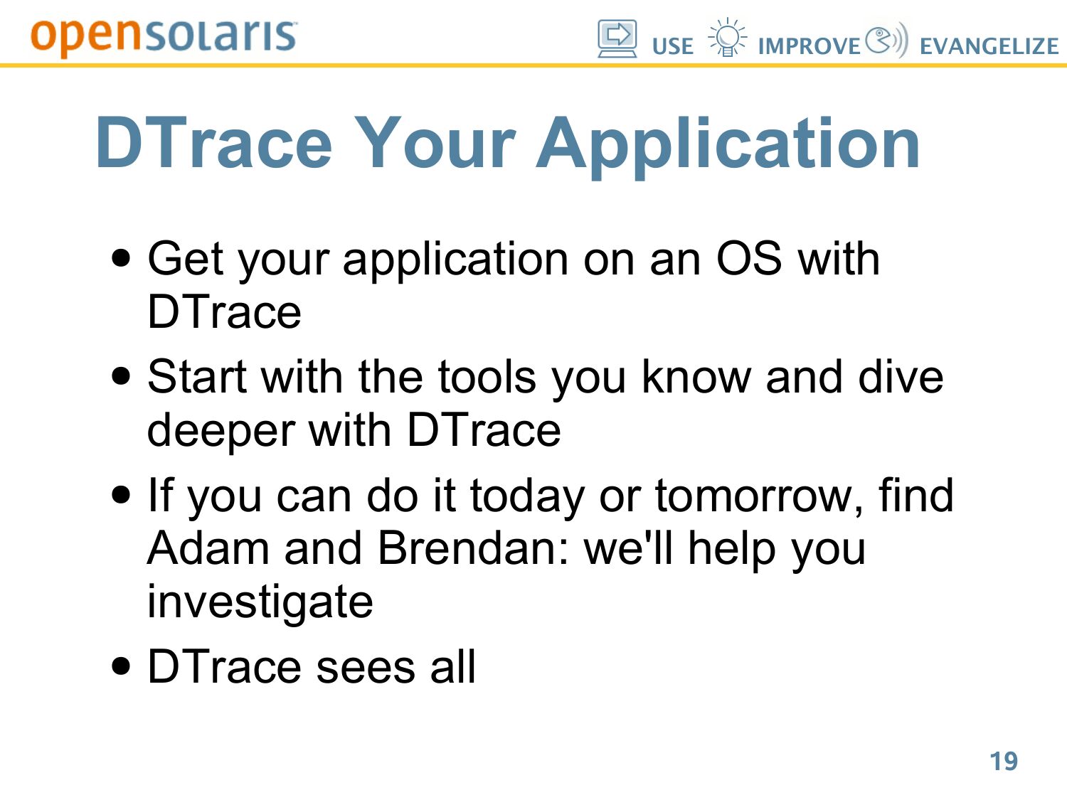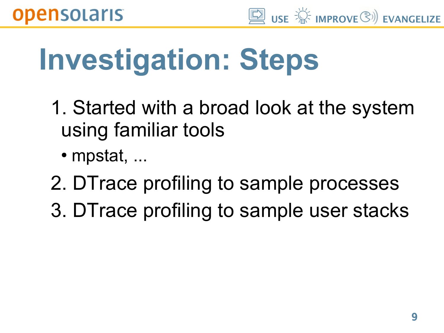 slide 9:USE IMPROVE EVANGELIZE Investigation: Steps 1. Started with a broad look at the system using familiar tools mpstat, ... 2. DTrace profiling to sample processes 3. DTrace profiling to sample user stacksslide 10: