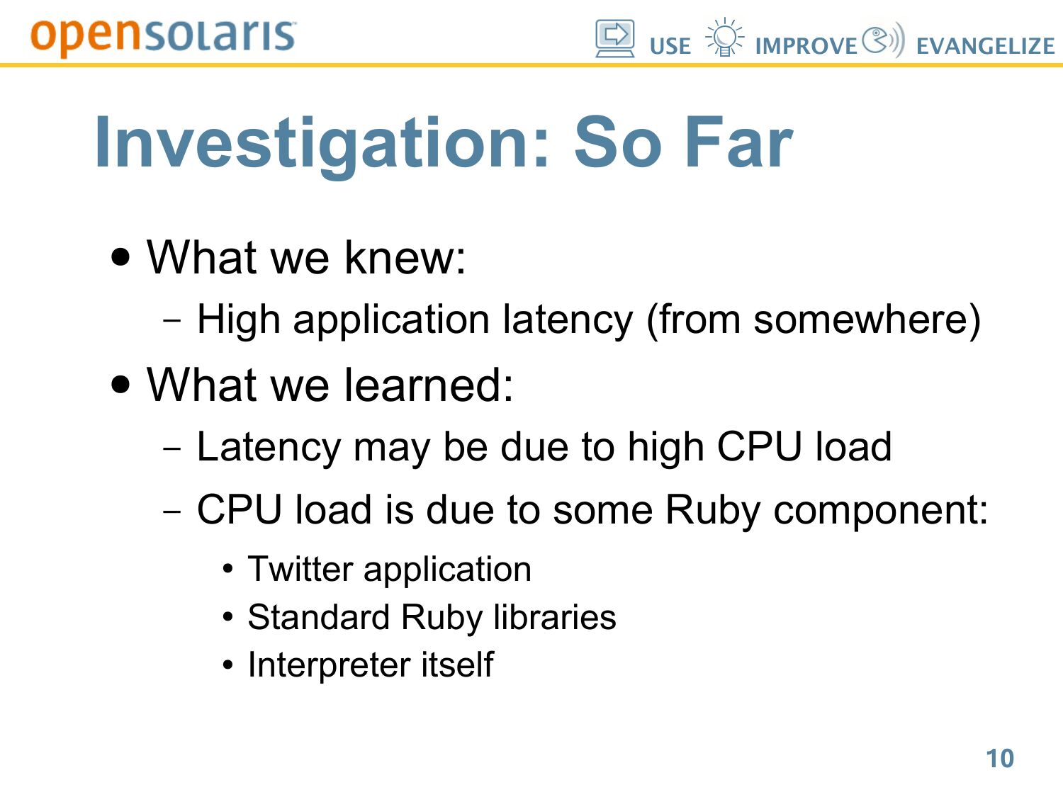 USE IMPROVE EVANGELIZE Investigation: So Far ● What we knew: – High application latency (from somewhere) ● What we learned: – Latency may be due to high CPU load – CPU load is due to some Ruby component: Twitter application ● Standard Ruby libraries ● Interpreter itselfslide 11: