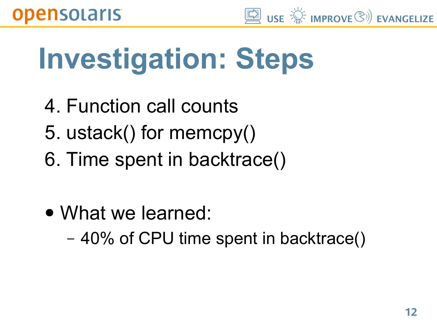 slide 12:USE IMPROVE EVANGELIZE Investigation: Steps 4. Function call counts 5. ustack() for memcpy() 6. Time spent in backtrace() ● What we learned: – 40% of CPU time spent in backtrace()slide 13: