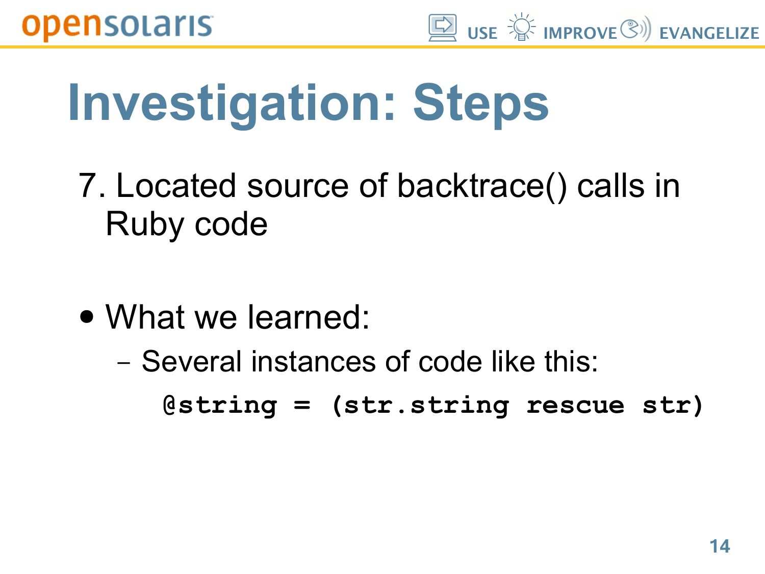 USE IMPROVE EVANGELIZE Investigation: Steps 7. Located source of backtrace() calls in Ruby code ● What we learned: – Several instances of code like this: @string = (str.string rescue str)slide 15: