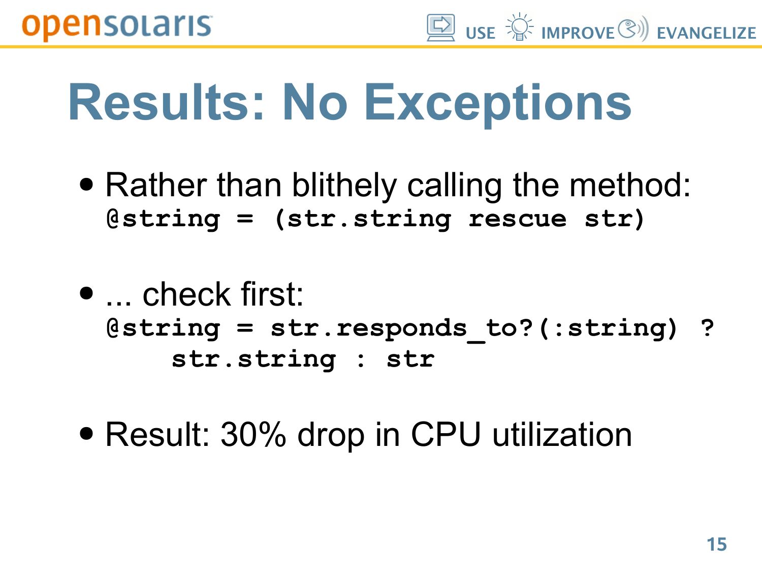 USE IMPROVE EVANGELIZE Results: No Exceptions ● Rather than blithely calling the method: @string = (str.string rescue str) ● ... check first: @string = str.responds_to?(:string) ? str.string : str ● Result: 30% drop in CPU utilizationslide 16: