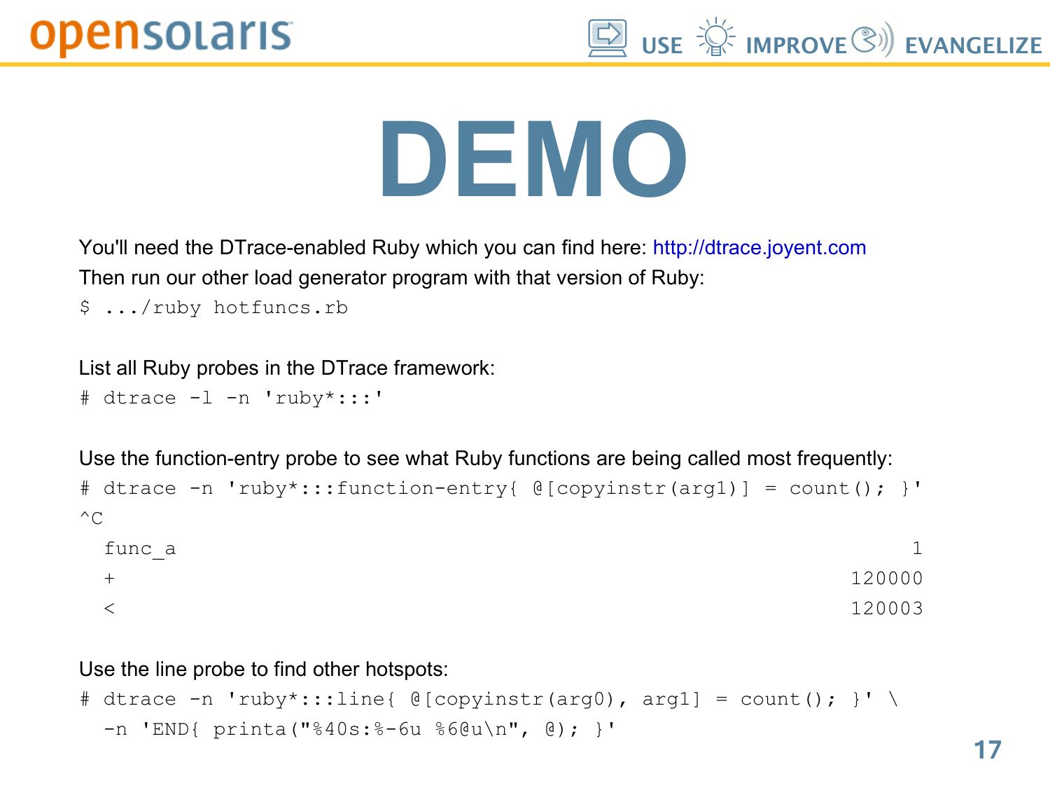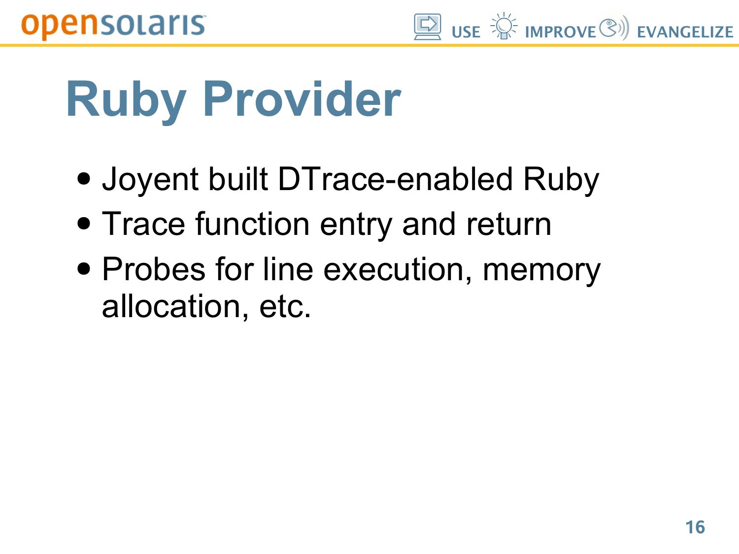 USE IMPROVE EVANGELIZE Ruby Provider ● Joyent built DTrace-enabled Ruby ● Trace function entry and return ● Probes for line execution, memory allocation, etc.slide 17: