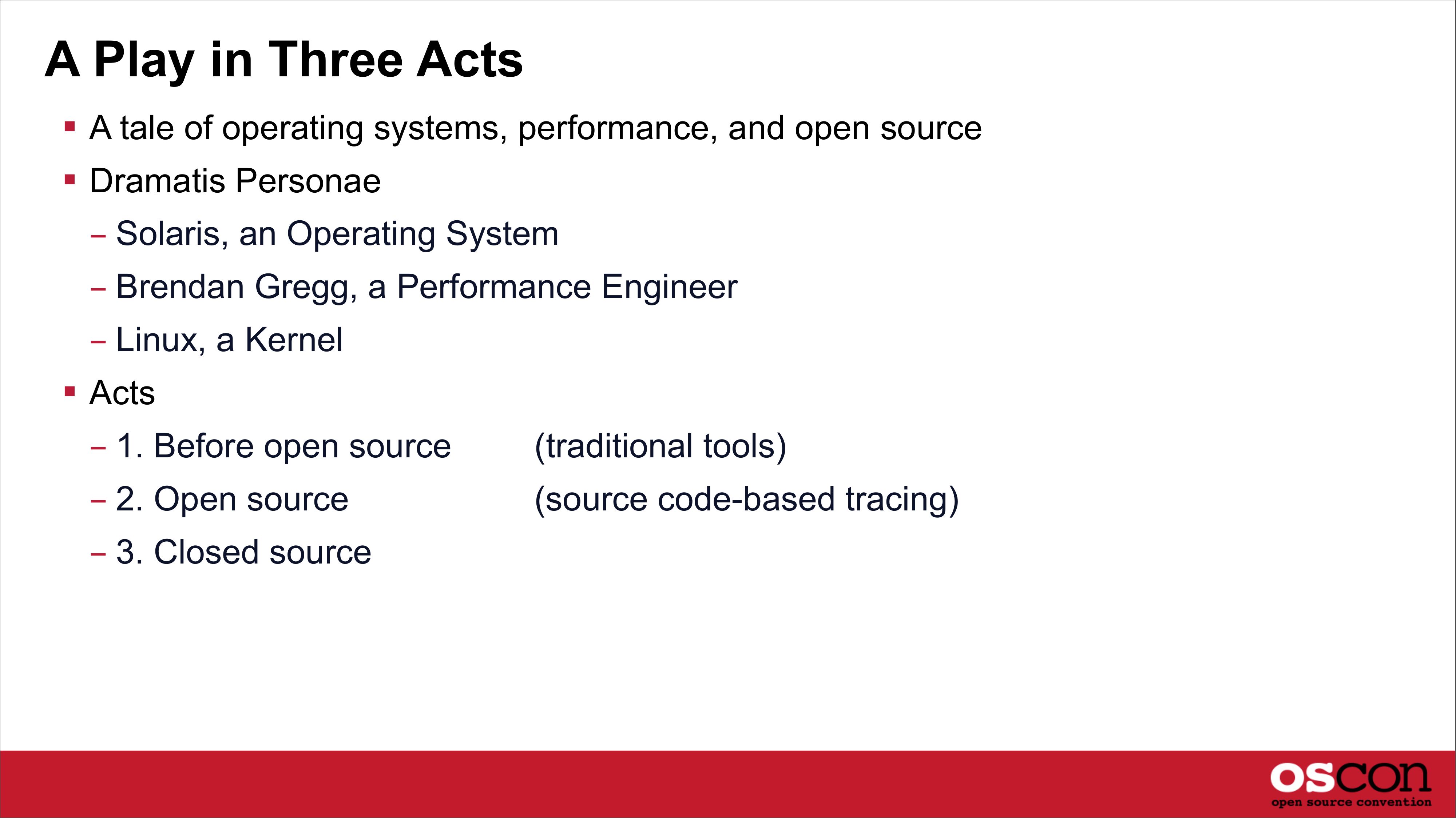 A Play in Three Acts A tale of operating systems, performance, and open source Dramatis Personae - Solaris, an Operating System - Brendan Gregg, a Performance Engineer - Linux, a Kernel Acts - 1. Before open source (traditional tools) - 2. Open source (source code-based tracing) - 3. Closed sourceslide 3: