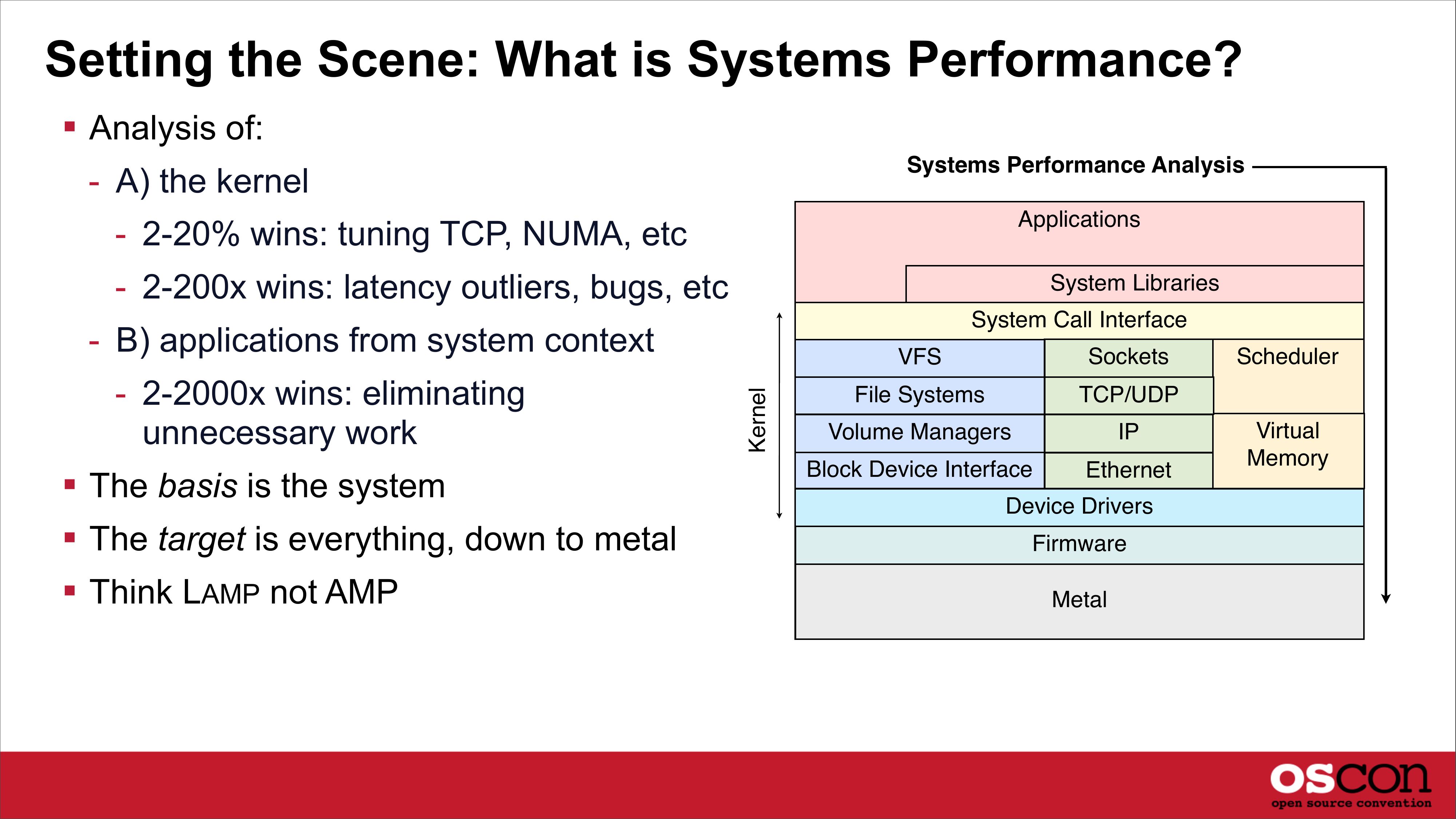 Setting the Scene: What is Systems Performance? Analysis of: Systems Performance Analysis - A) the kernel Applications - 2-20% wins: tuning TCP, NUMA, etc - 2-200x wins: latency outliers, bugs, etc System Libraries System Call Interface - 2-2000x wins: eliminating unnecessary work The basis is the system The target is everything, down to metal Think LAMP not AMP Kernel - B) applications from system context VFS Sockets File Systems TCP/UDP Volume Managers Block Device Interface Ethernet Device Drivers Firmware Metal Scheduler Virtual Memoryslide 5: